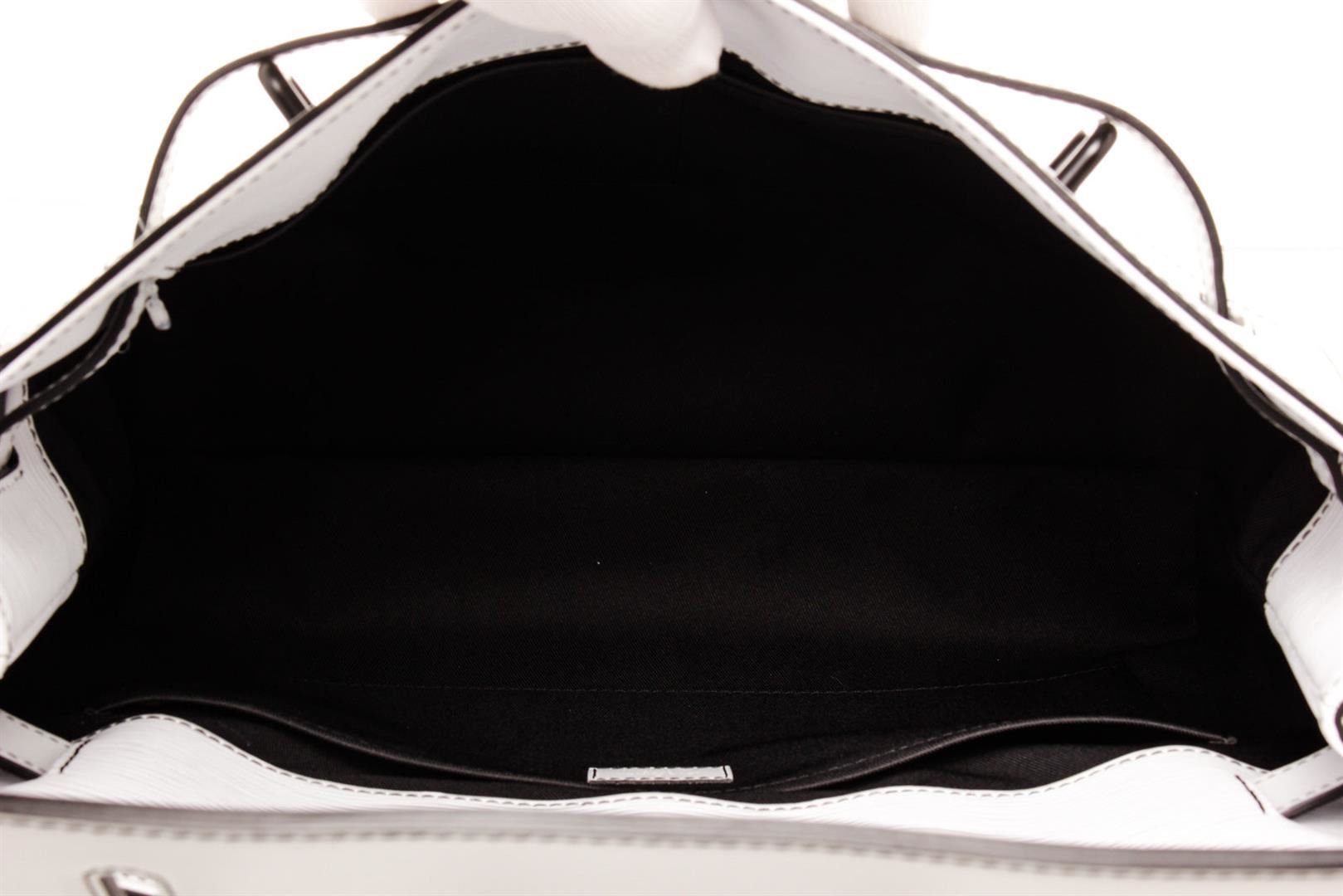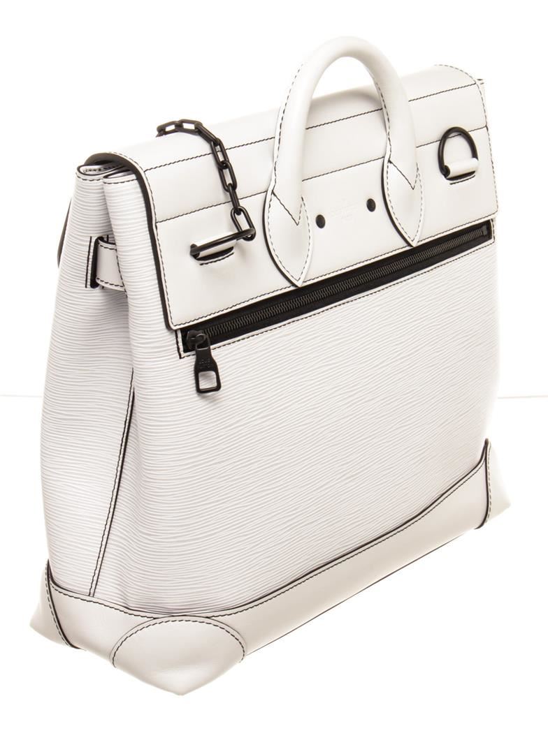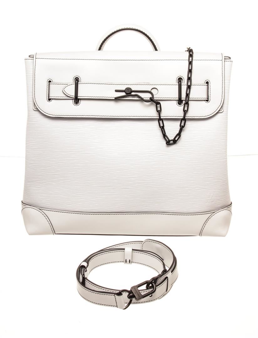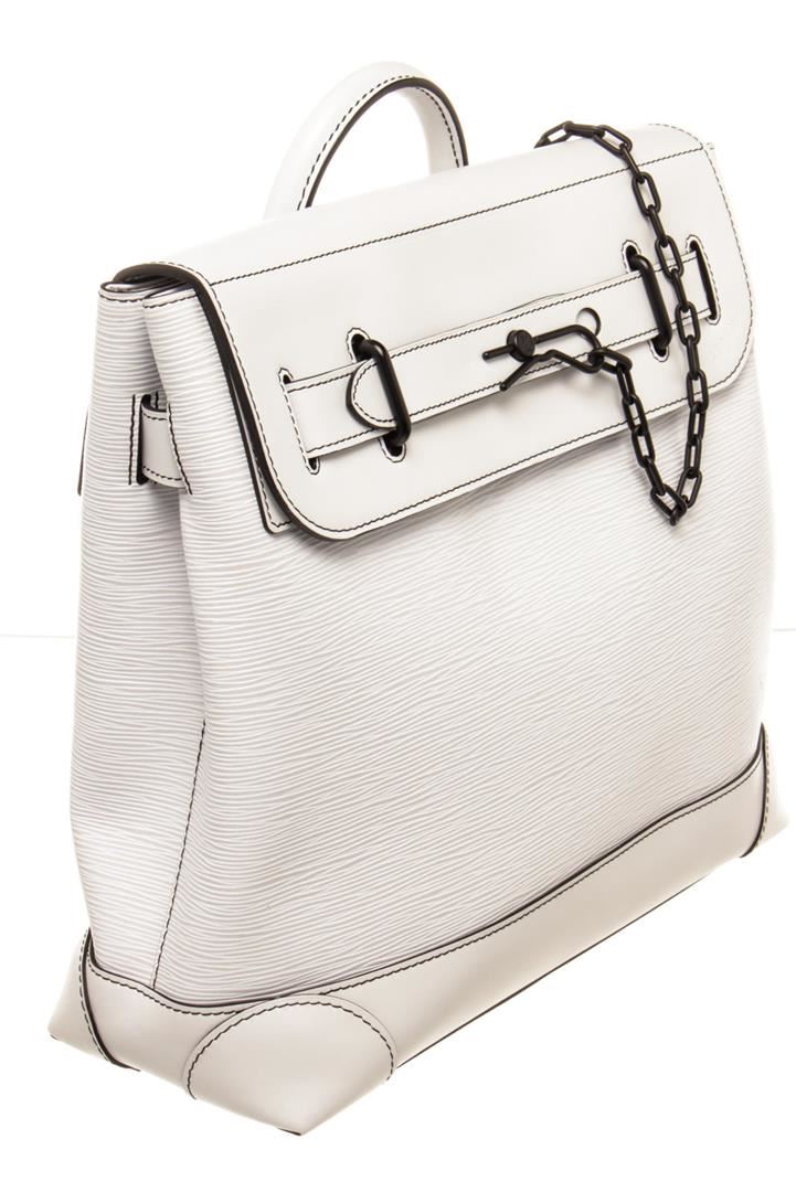 Louis Vuitton White Epi Leather Steamer Shoulder Bag with Crafted our of monogram solar ray canvas, black cowhide leather trim, and black metal hardware, matte orange resin chain. Inner black canvas lining snap closure.