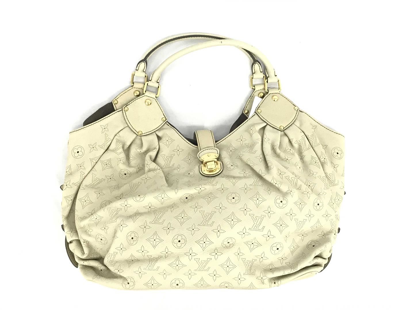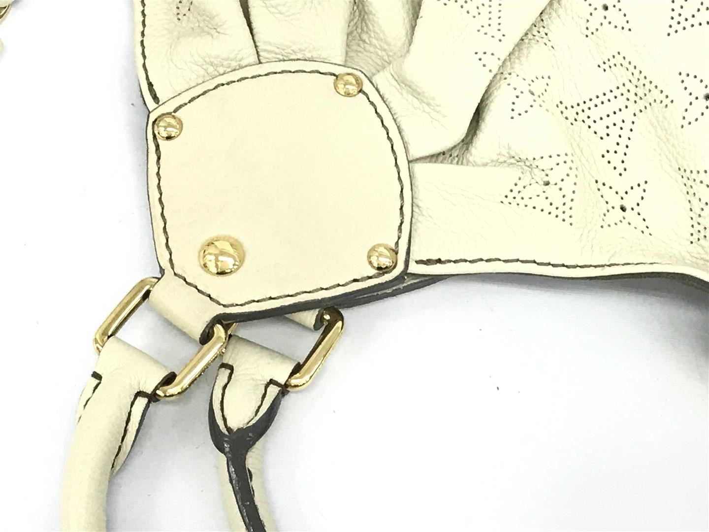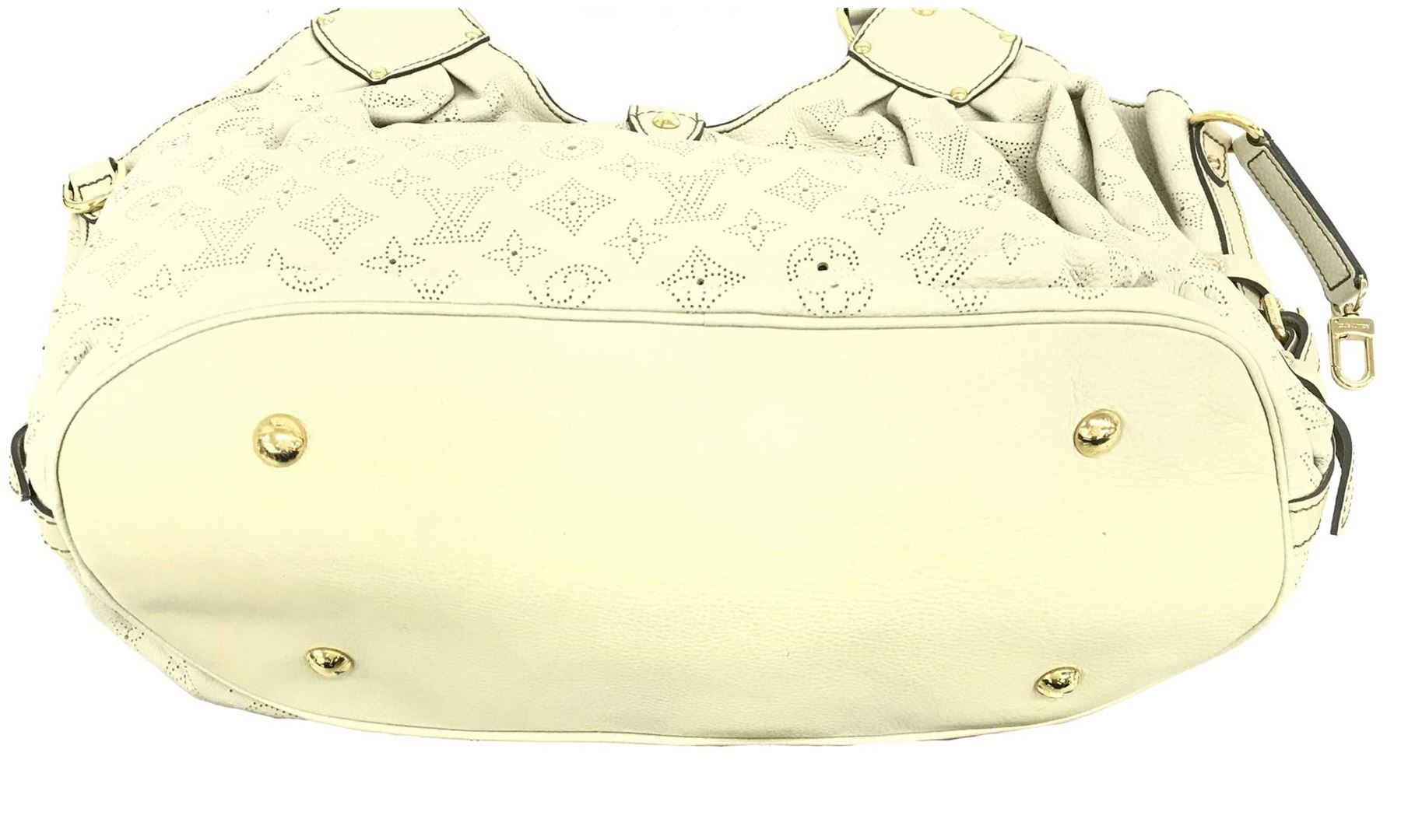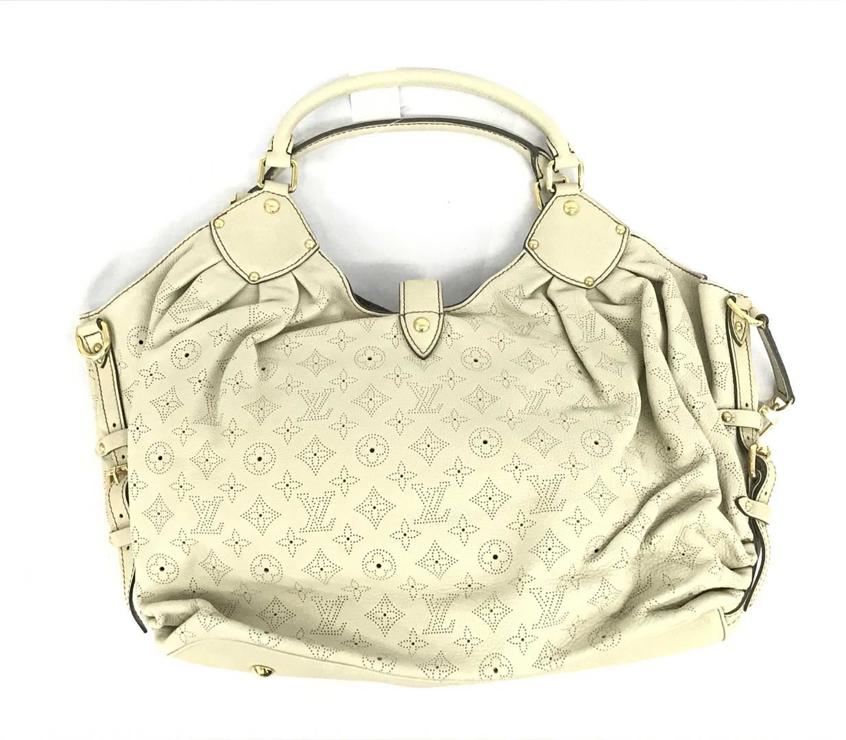 White perforated monogram Mahina leather Louis Vuitton XL hobo bog with calfskin leather, gray Alcantara interior lining, one zip pocket, double rolled leather handles, open top with leather flap tab and push-lock closure, gold-tone hardware. 15.5" at b