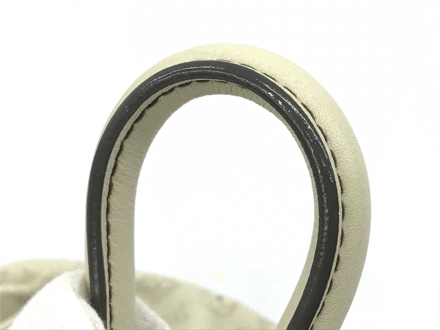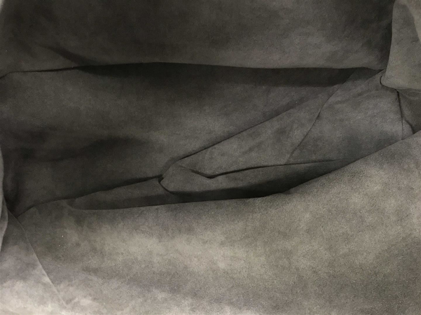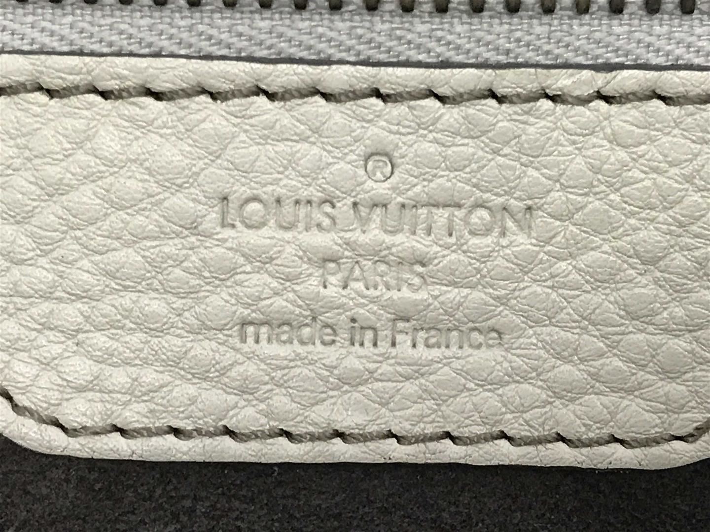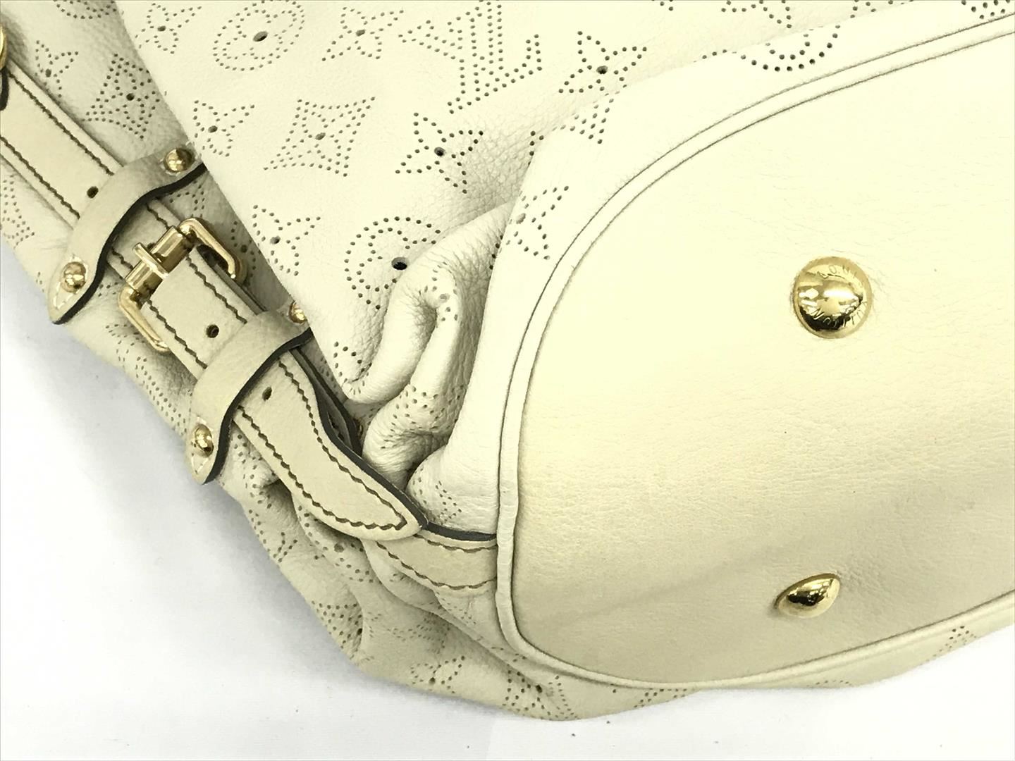 White perforated monogram Mahina leather Louis Vuitton XL hobo bog with calfskin leather, gray Alcantara interior lining, one zip pocket, double rolled leather handles, open top with leather flap tab and push-lock closure, gold-tone hardware. 15.5" at b
