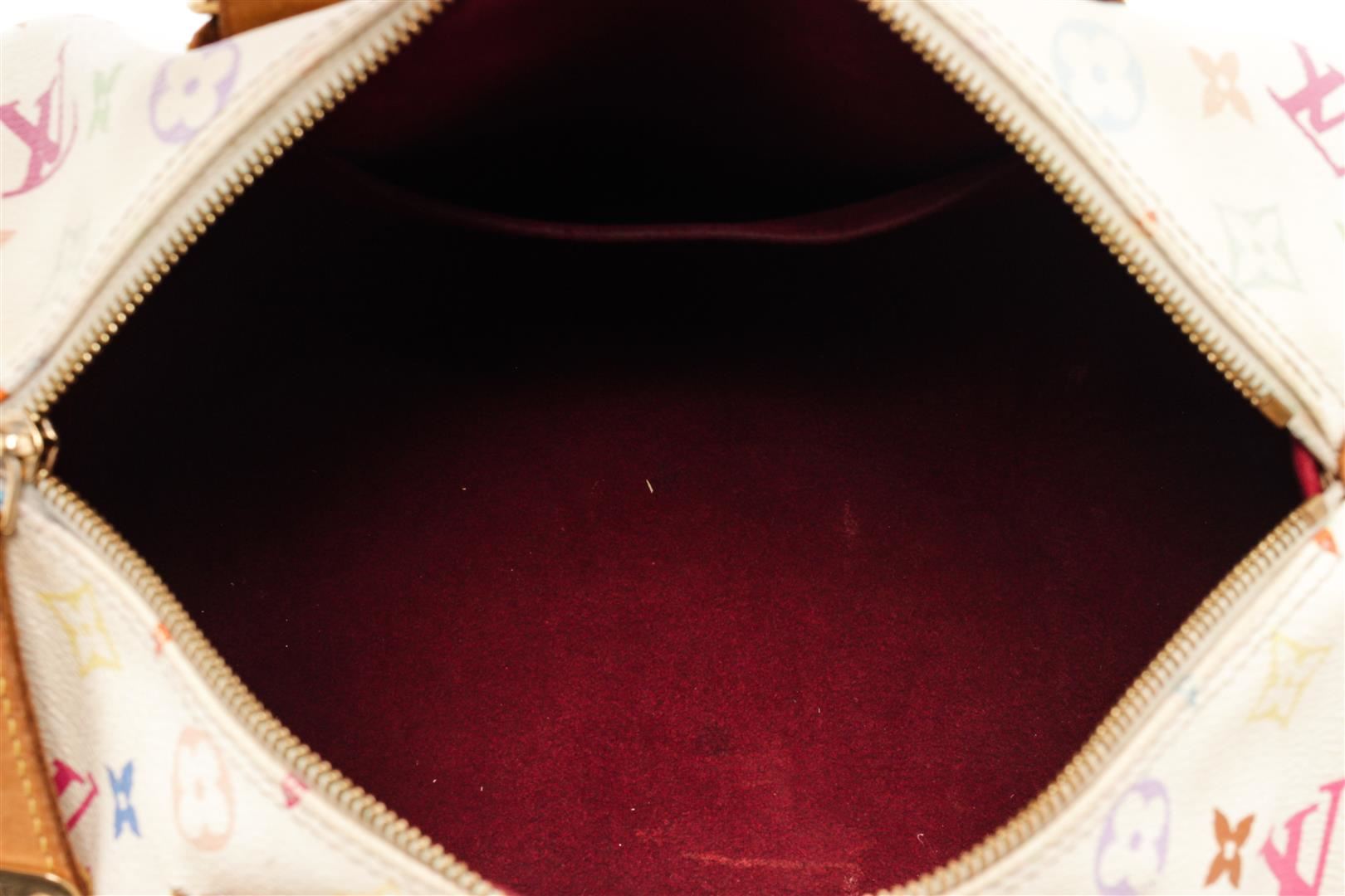 Louis Vuitton White Multicolor Monogram Leather Speedy 30 Satchel Bag. All available information is listed in the description and shown in the photos. Louis Vuitton White Multicolor Monogram Leather Speedy 30 Satchel Bag with multicolore monogram pattern, brass hardware, leather trim, rolled handles, single exterior pocket, alcantara lining & single interior pocket, zip closure at top, protective feet at base. Height: 9.25" Width: 13.25" Depth: 6.5", Handle Drop: 4.25" / 23.49 x 33.65 x 16.51 Cm