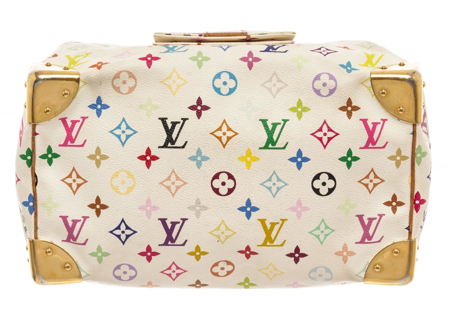 Louis Vuitton White Multicolor Monogram Leather Speedy 30 Satchel Bag. All available information is listed in the description and shown in the photos. Louis Vuitton White Multicolor Monogram Leather Speedy 30 Satchel Bag with multicolore monogram pattern, brass hardware, leather trim, rolled handles, single exterior pocket, alcantara lining & single interior pocket, zip closure at top, protective feet at base. Height: 9.25" Width: 13.25" Depth: 6.5", Handle Drop: 4.25" / 23.49 x 33.65 x 16.51 Cm