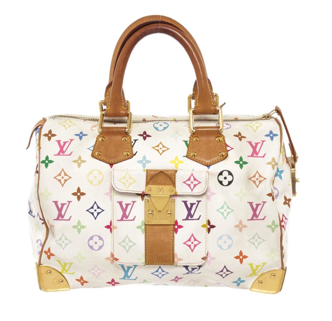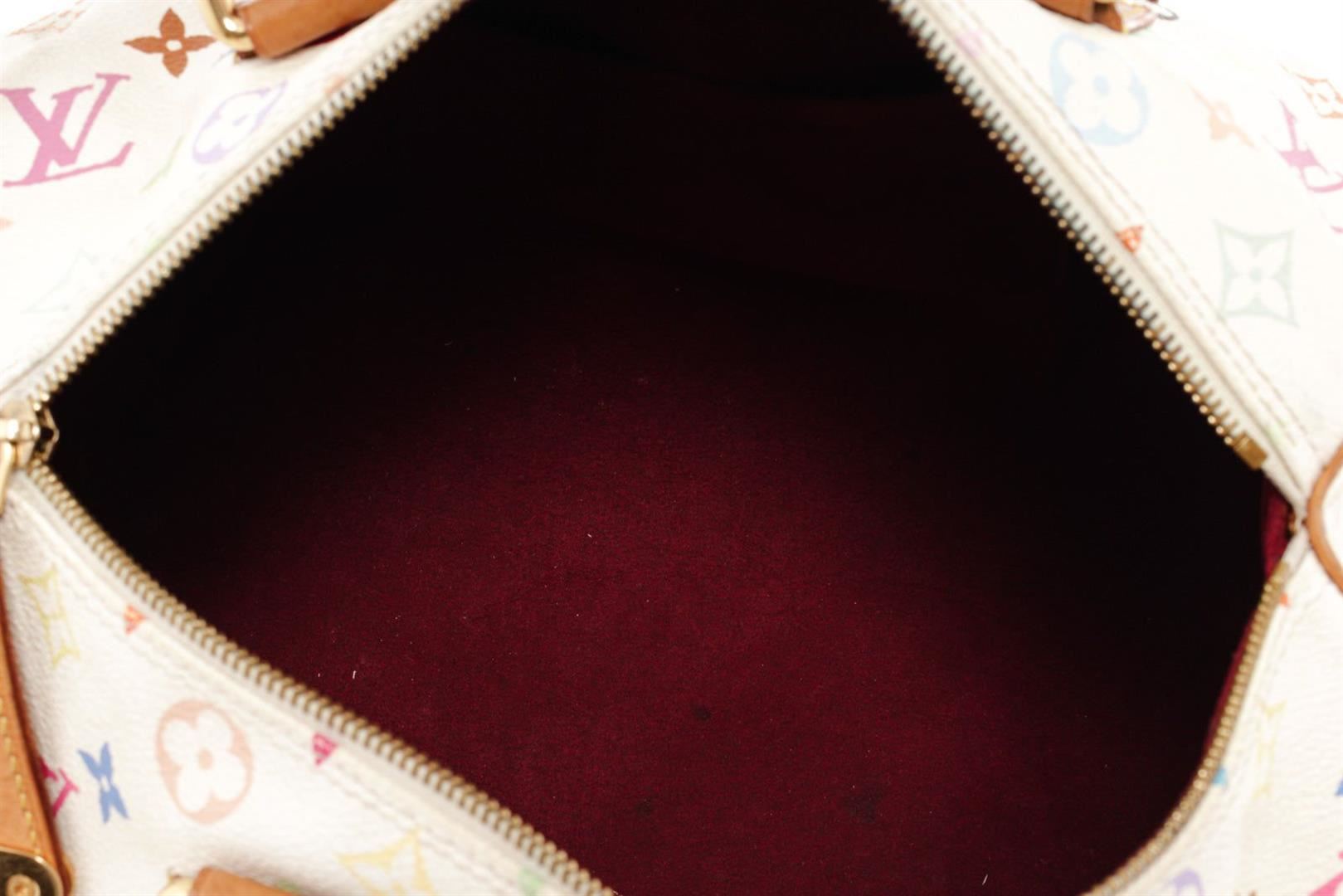White multicolor monogram coated canvas Louis Vuitton Speedy 30 Takashi Murakami handbag with gold-tone hardware, tan vachetta leather trim, dual rolled top handles, single exterior pocket with flap and S-lock closure, red Alcantara lining, single slit po