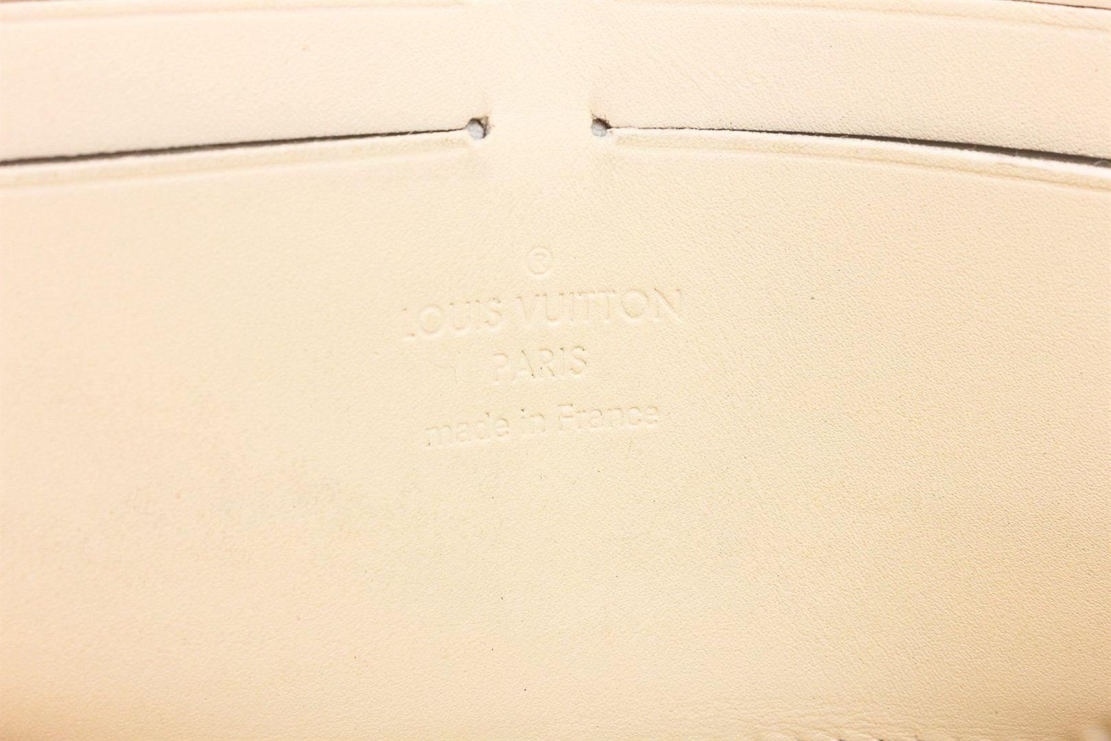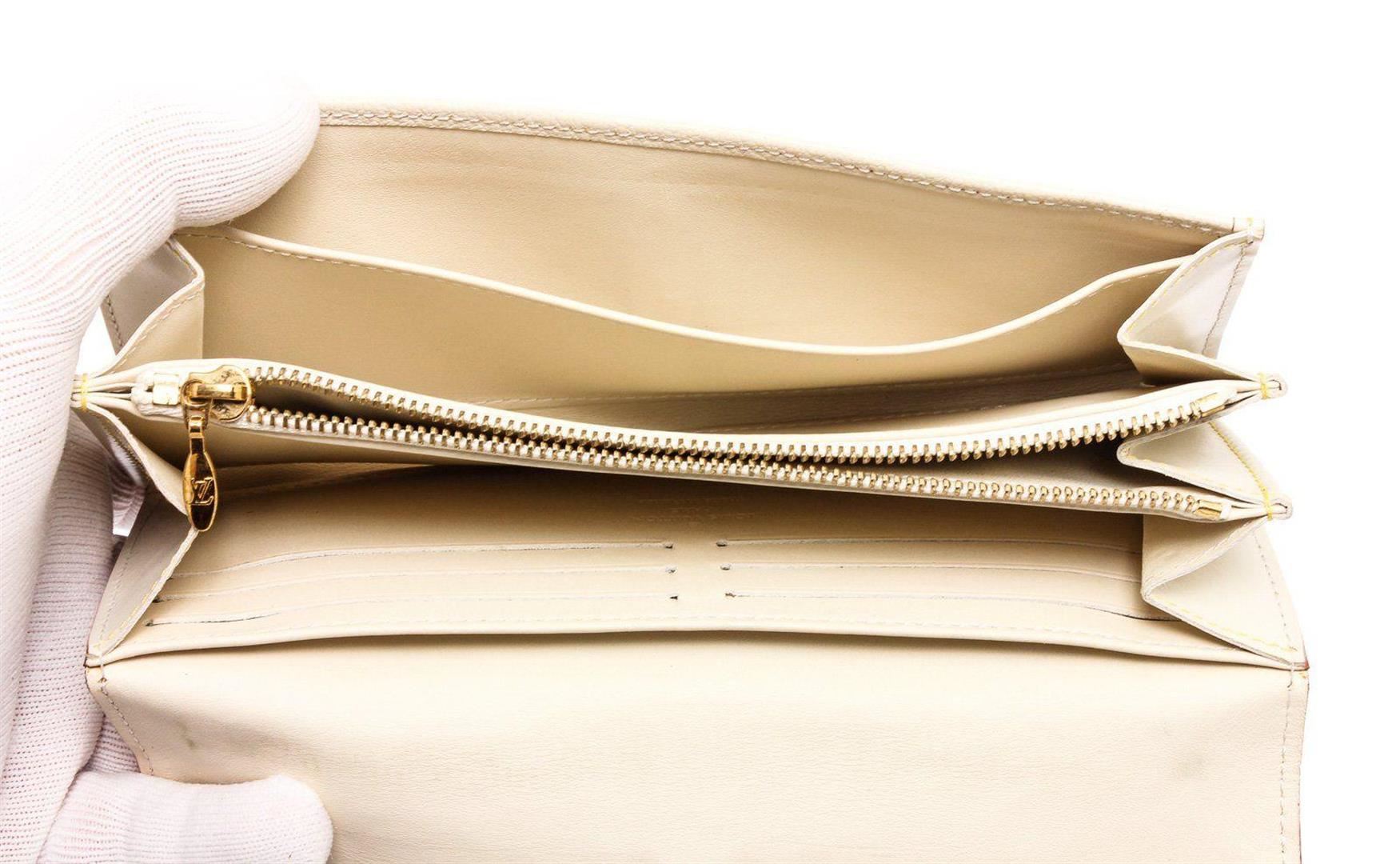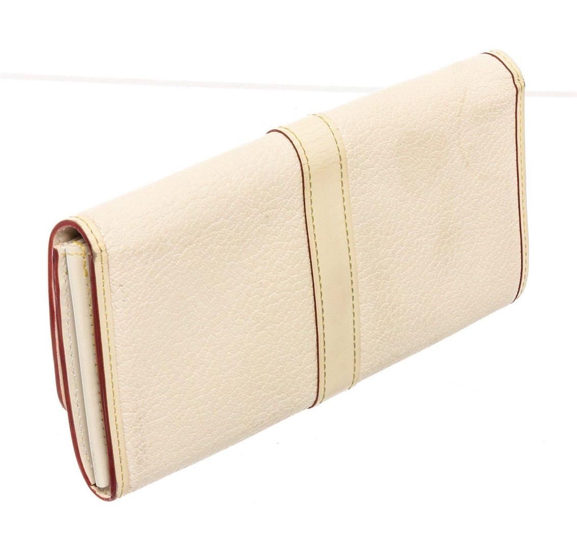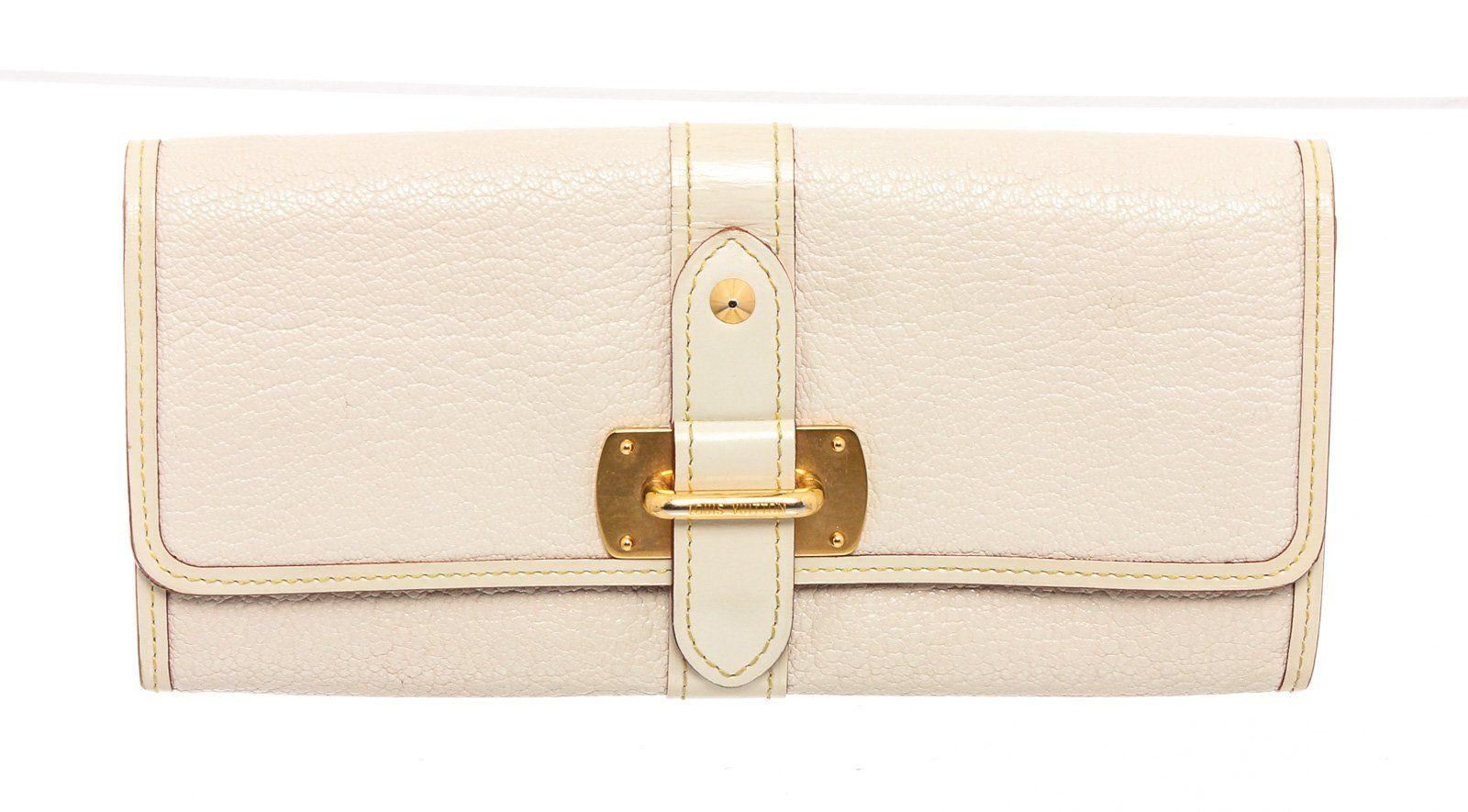 White Suhali leather Louis Vuitton Le Favori wallet with brass hardware, zip pocket at back, six card slots at flap underside, creme contrast stitching throughout, tonal leather lining, three interior compartments; one with zip closure, dual bill compartments at interior walls, eight card slots and snap closure at front flap featuring logo accent.