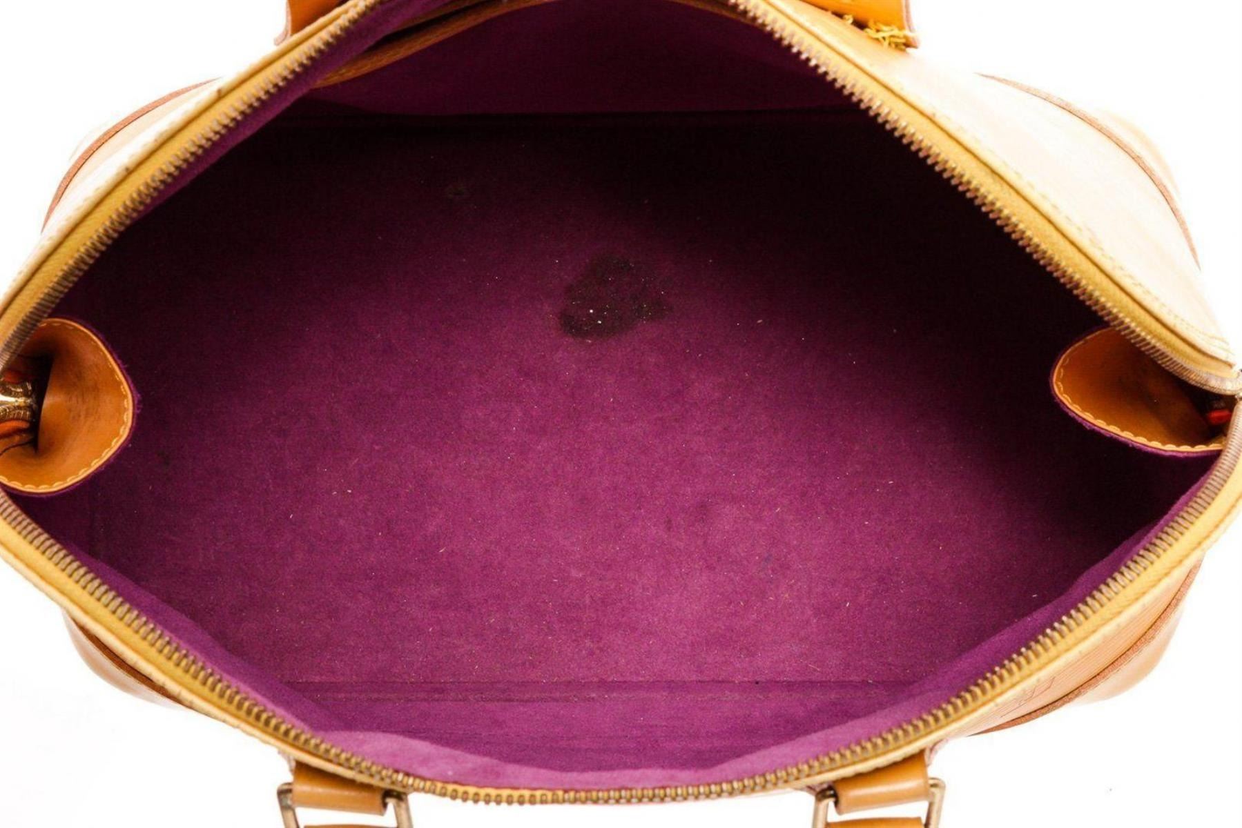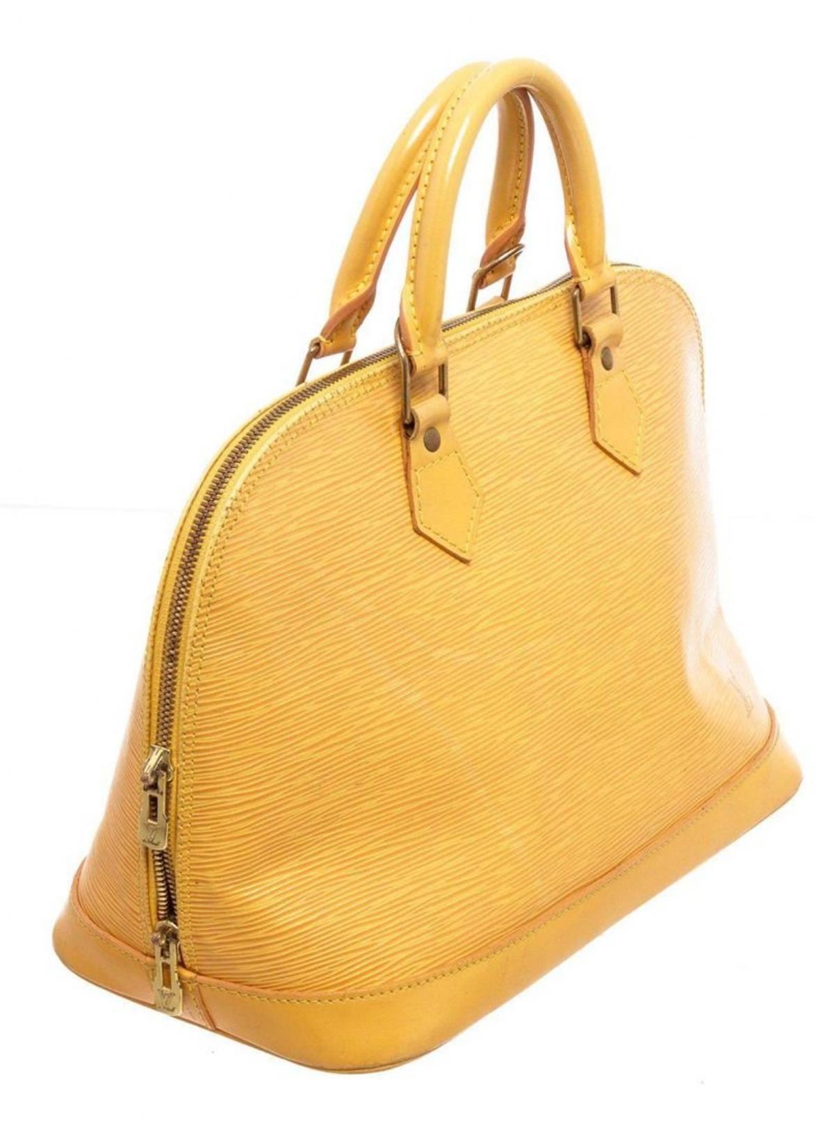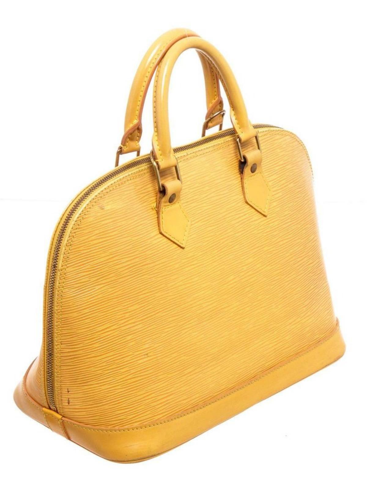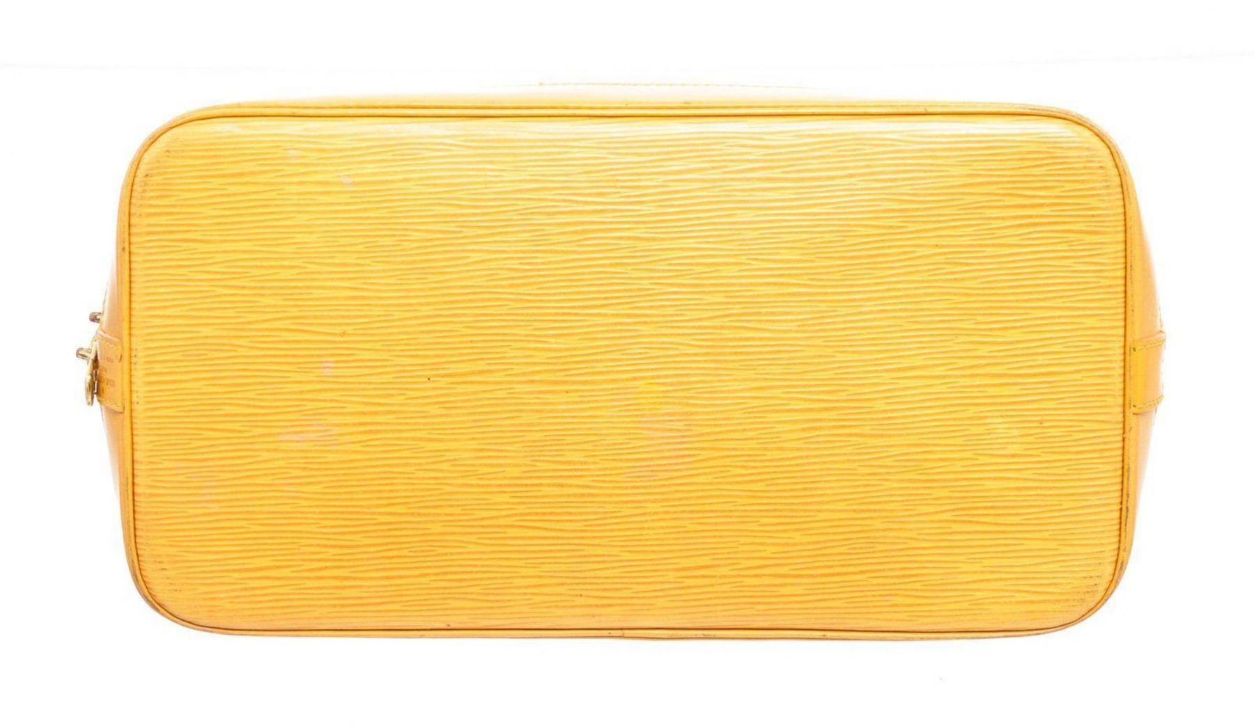 Louis Vuitton Yellow Epi Leather Alma MM Hobo Bag with gold-tone hardware, tan Vachetta leather trim, interior zip pockets, dual top handle, and zipper closure. Measurements: Length: 5.75 in / 15 cm Width: 9.25 in / 23 cm 9.25 in / 23 cm Condition: Pre-Owned Good overall, please see photographs for detail.
