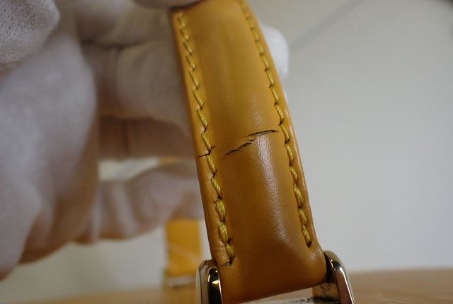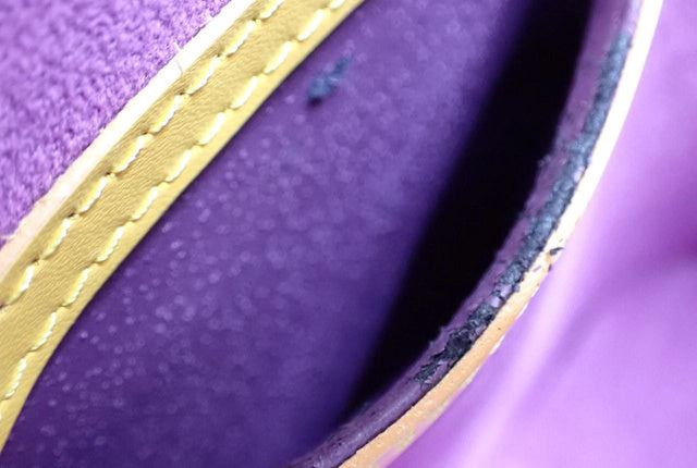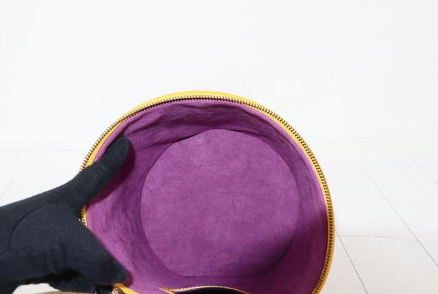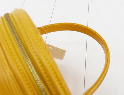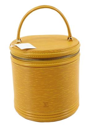 Yellow Epi leather Louis Vuitton Cannes bucket bag with gold-tone hardware, single flat top handle, pink Alcantara lining, single slit pocket at interior wall and zip-around closure at top. 8"x6"x7.5"xBag Drop:4"/mx15.2cmx19cmxBag Drop:10.1cm