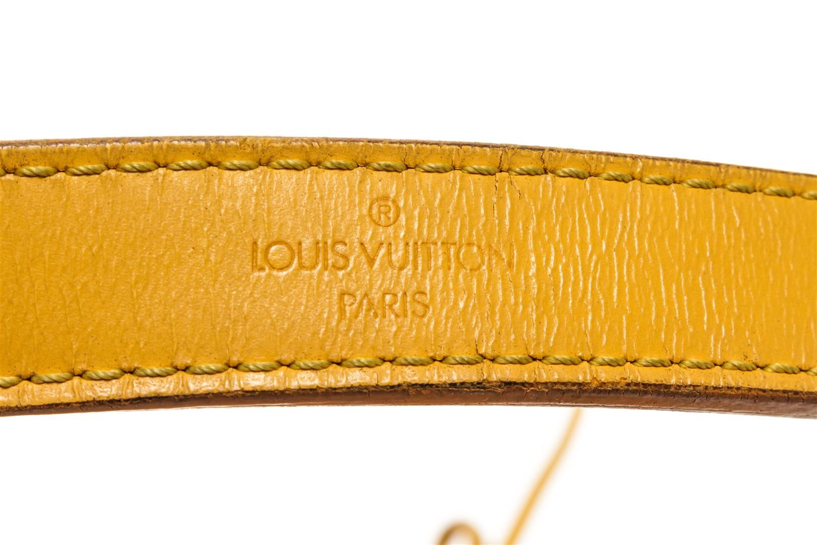 One Louis Vuitton Yellow Epi Leather Noe Bucket Bag. Item is sold AS-IS. All available information is listed in the description and shown in the photo. Louis Vuitton Yellow Epi Leather Noe Bag with gold-tone hardware, yellow leather trim, purple suede lining, single adjustable leather shoulder strap, and drawstring closure. .