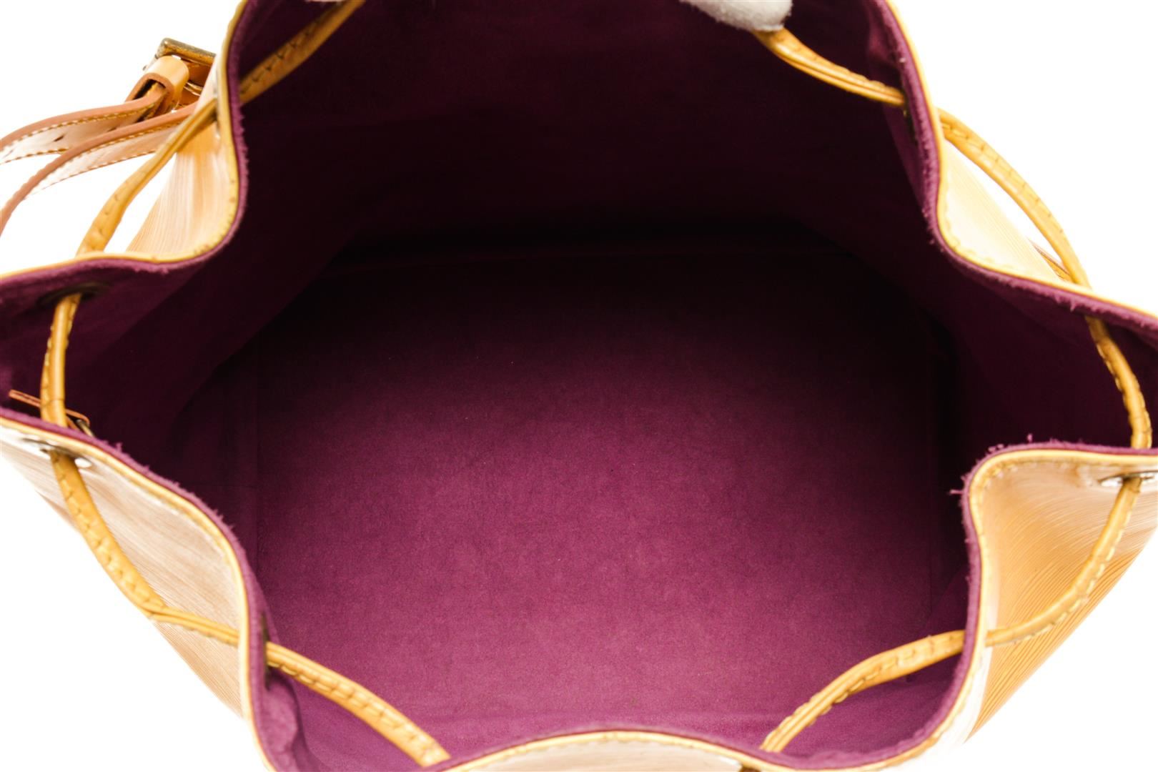 One Louis Vuitton Yellow Epi Leather Noe Bucket Bag. Item is sold AS-IS. All available information is listed in the description and shown in the photo. Louis Vuitton Yellow Epi Leather Noe Bag with gold-tone hardware, yellow leather trim, purple suede lining, single adjustable leather shoulder strap, and drawstring closure. .