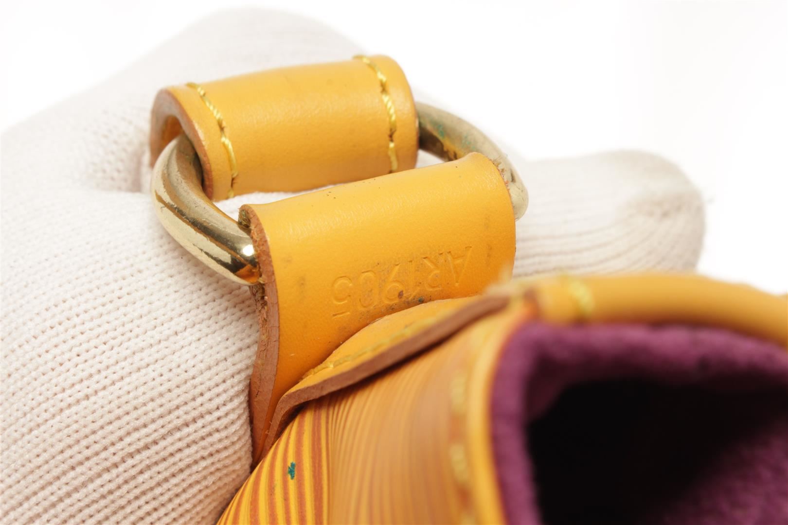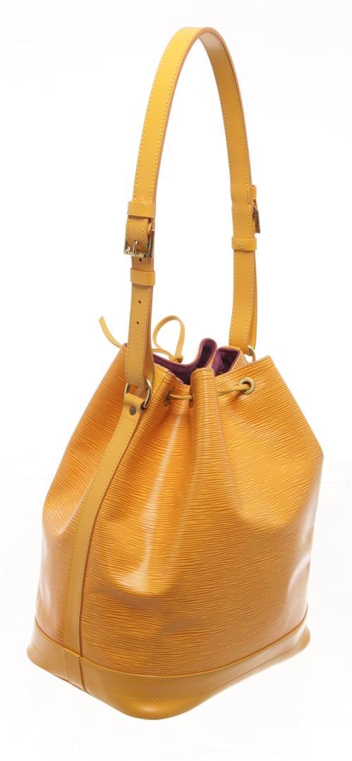 One Louis Vuitton Yellow Epi Leather Noe GM Shoulder Bag. Item is sold AS-IS. All available information is listed in the description and shown in the photo. louis vuitton yellow epi leather noe gm shoulder bag with yellow epi leather, with brass hardware, adjustable flat shoulder strap, drawstring closure at front face opening to violet alcantara lined interior. 13"h, 16"w, 17.5"d / 33.02 x 40.64 x 44.45 cm