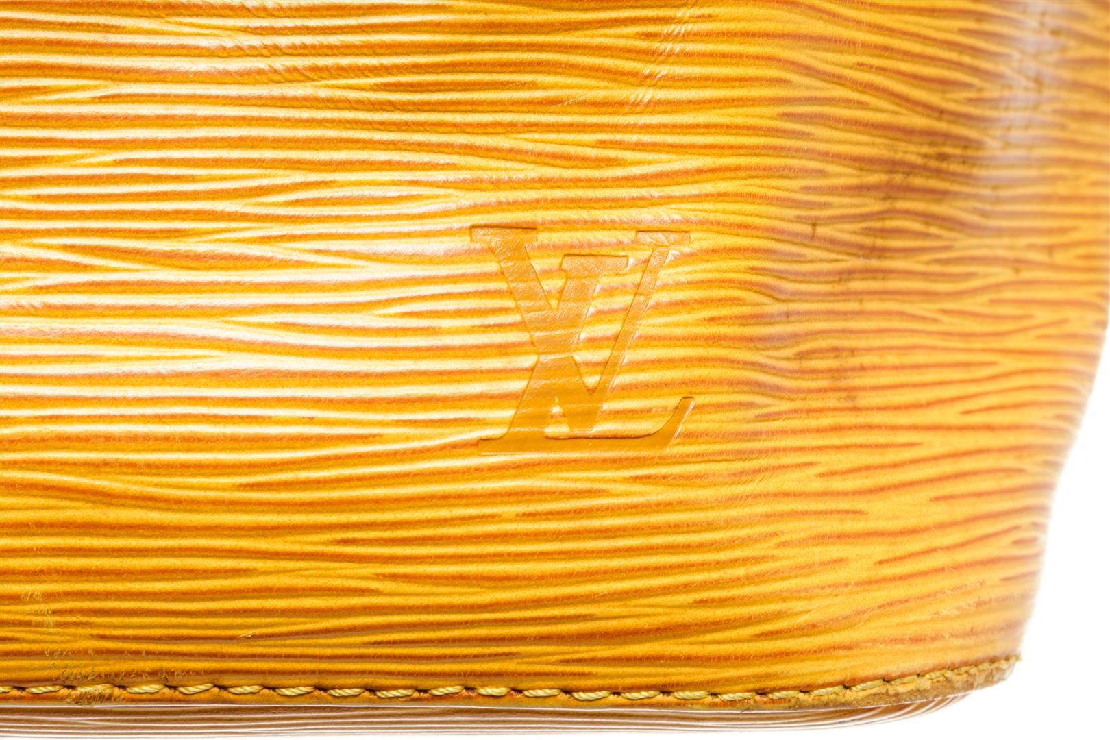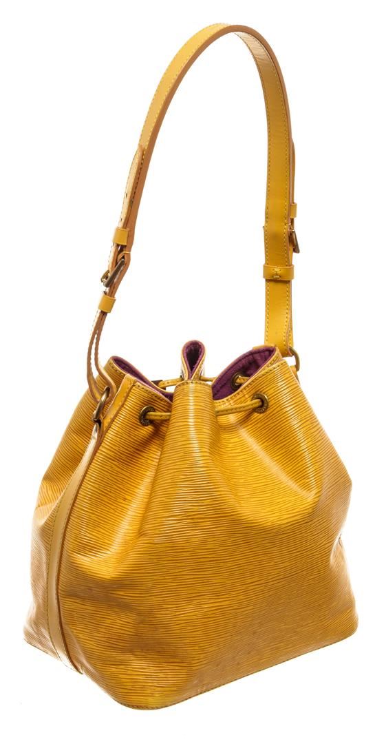 One Louis Vuitton Yellow Epi Leather Noe PM Bag. Item is sold AS-IS. All available information is listed in the description and shown in the photo. Louis Vuitton Yellow Epi Leather Petit Noe Bag with gold-tone hardware, yellow leather trim, four rounded holes at the base, purple suede lining, single adjustable leather shoulder strap, and drawstring closure. .