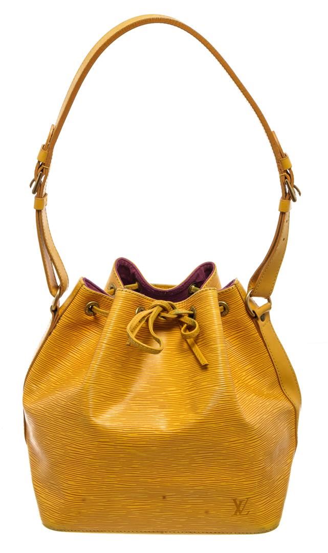 One Louis Vuitton Yellow Epi Leather Noe PM Bag. Item is sold AS-IS. All available information is listed in the description and shown in the photo. Louis Vuitton Yellow Epi Leather Petit Noe Bag with gold-tone hardware, yellow leather trim, purple suede lining, single adjustable leather shoulder strap, and drawstring closure. .