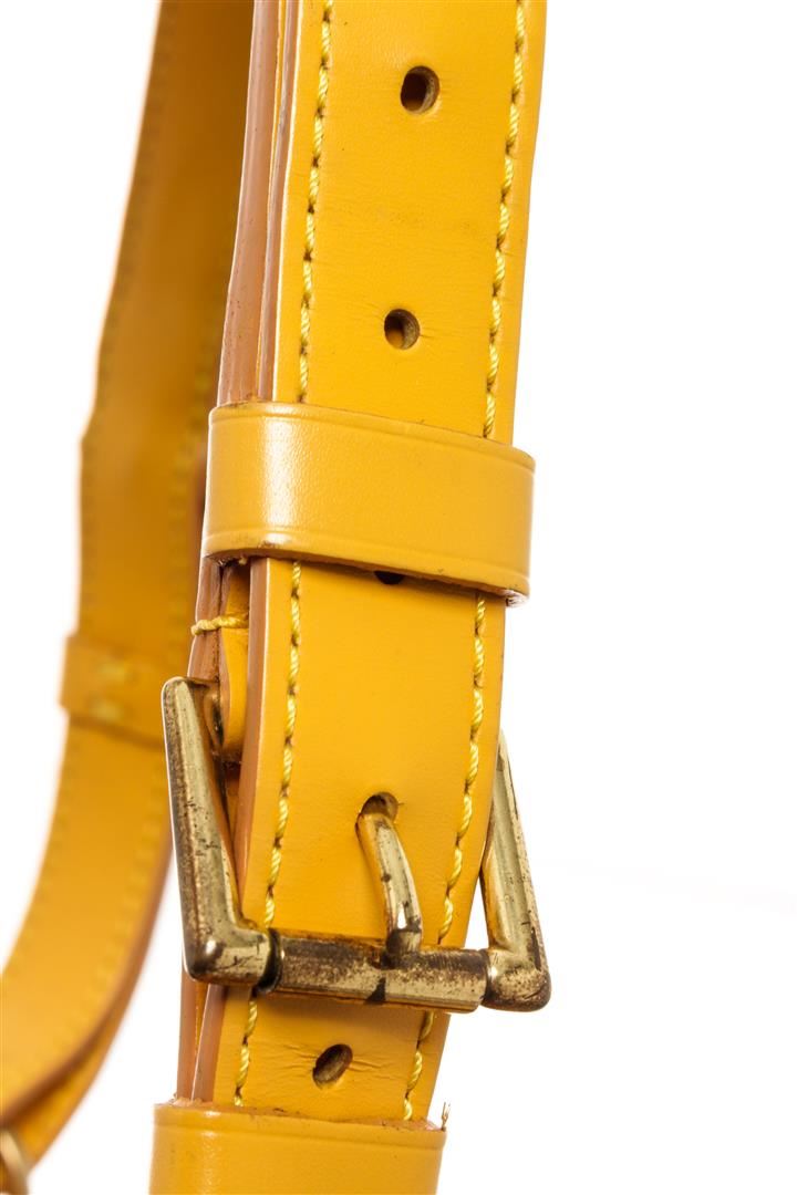 One Louis Vuitton Yellow Epi Leather Noe PM Bag. Item is sold AS-IS. All available information is listed in the description and shown in the photo. Louis Vuitton Yellow Epi Leather Petit Noe Bag with gold-tone hardware, yellow leather trim, four rounded holes at the base, purple suede lining, single adjustable leather shoulder strap, and drawstring closure. .