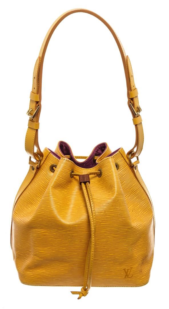 One Louis Vuitton Yellow Epi Leather Noe PM Bag. Item is sold AS-IS. All available information is listed in the description and shown in the photo. Louis Vuitton Yellow Epi Leather Petit Noe Bag with gold-tone hardware, yellow leather trim, four rounded holes at the base, purple suede lining, single adjustable leather shoulder strap, and drawstring closure. .