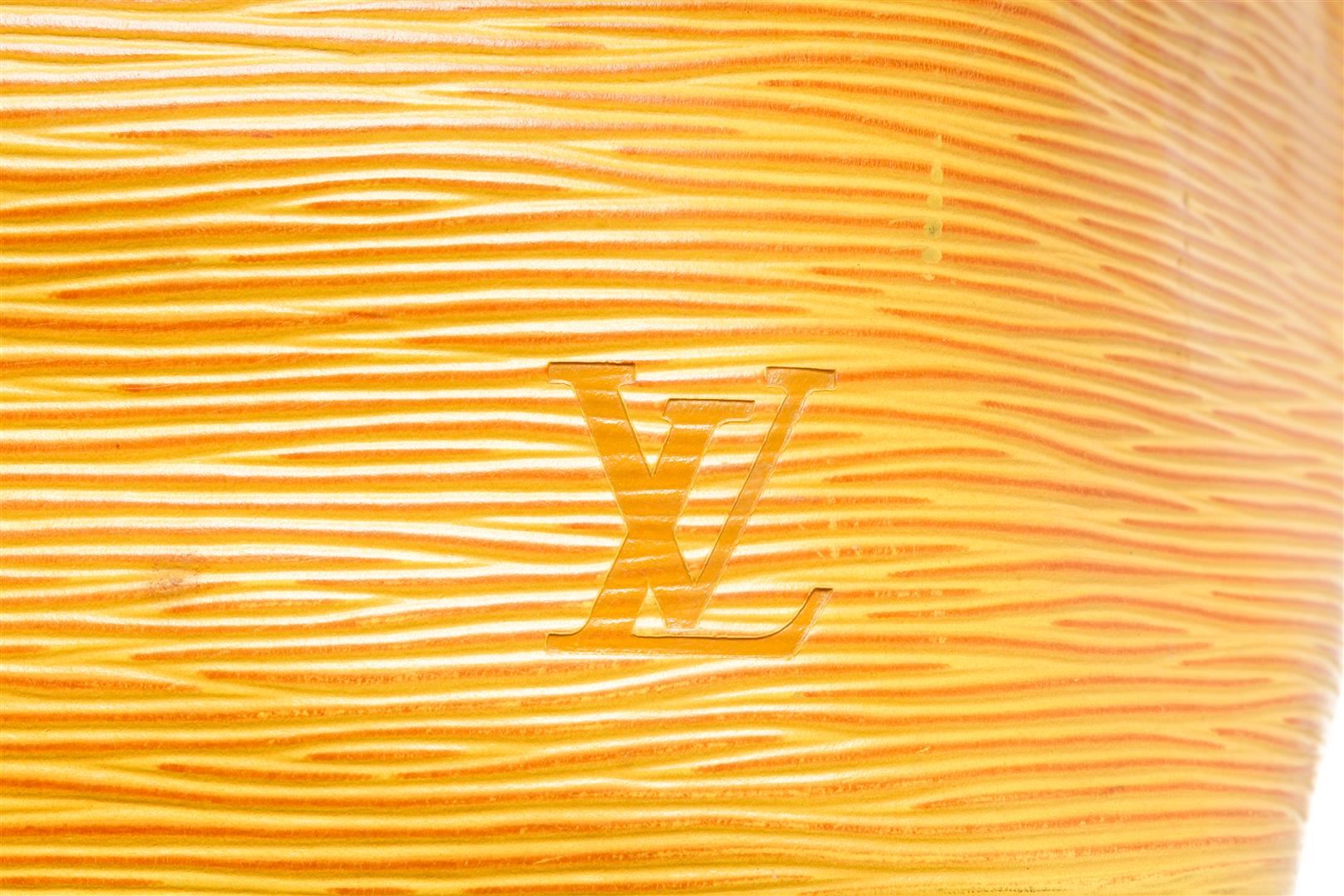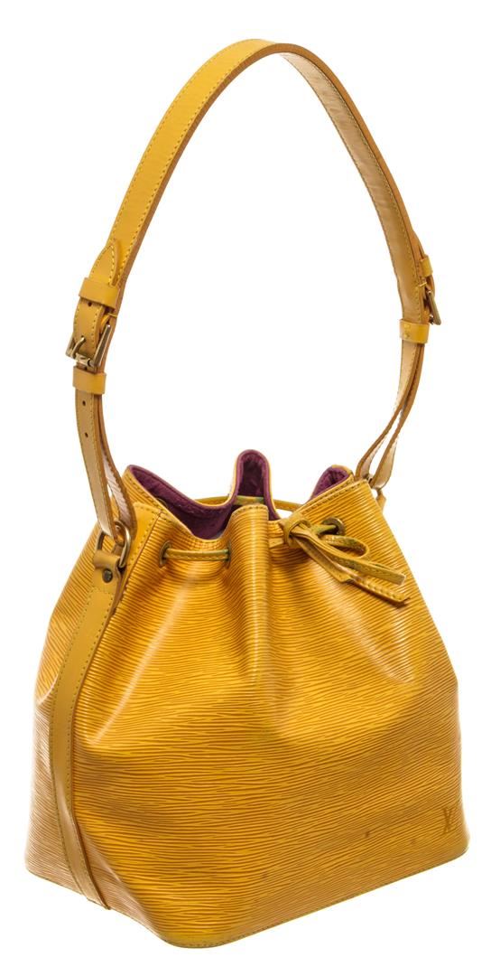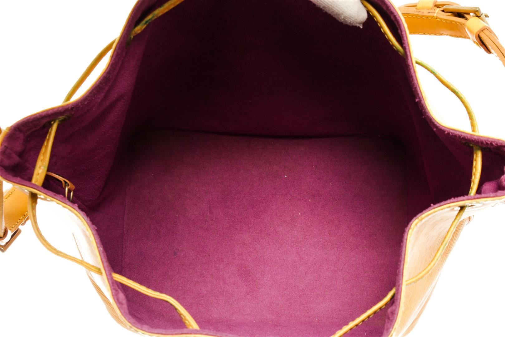 One Louis Vuitton Yellow Epi Leather Noe PM Bag. Item is sold AS-IS. All available information is listed in the description and shown in the photo. Louis Vuitton Yellow Epi Leather Petit Noe Bag with gold-tone hardware, yellow leather trim, purple suede lining, single adjustable leather shoulder strap, and drawstring closure. .