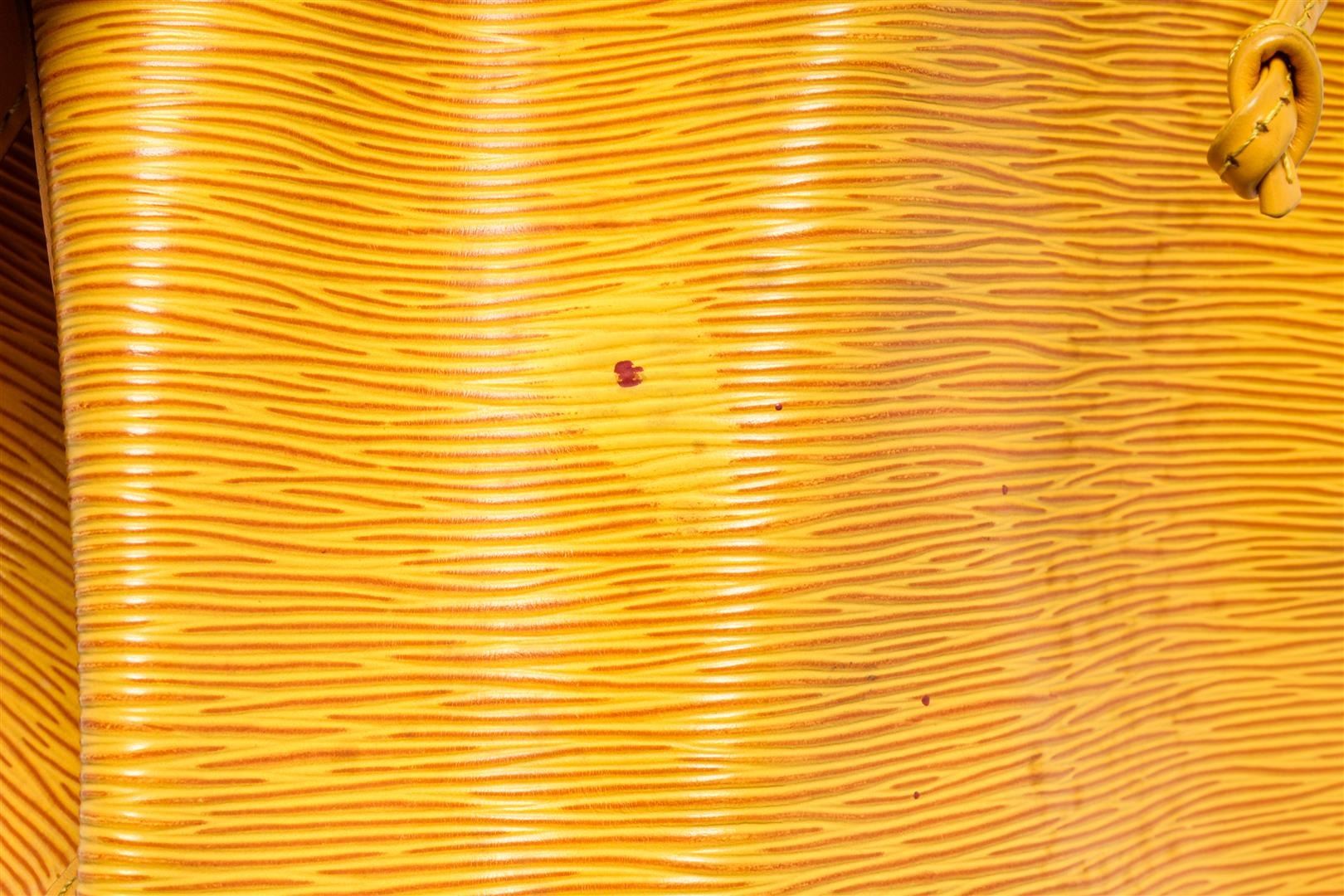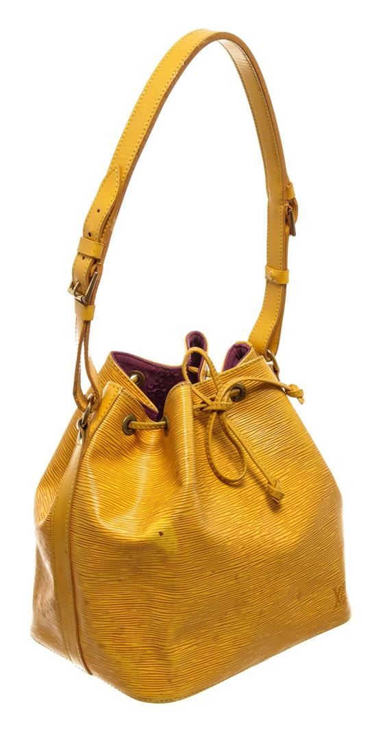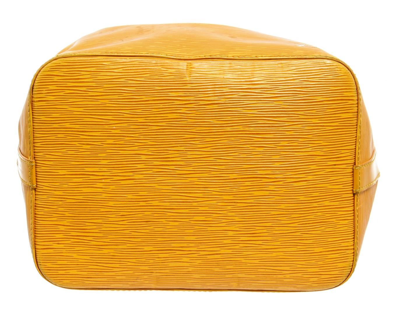 One Louis Vuitton Yellow Epi Leather Noe PM Bucket Bag. Item is sold AS-IS. All available information is listed in the description and shown in the photo. Yellow Epi leather Louis Vuitton Noe PM with gold-tone hardware, adjustable flat shoulder strap, fuchsia Alcantara lining and drawstring closure at top.