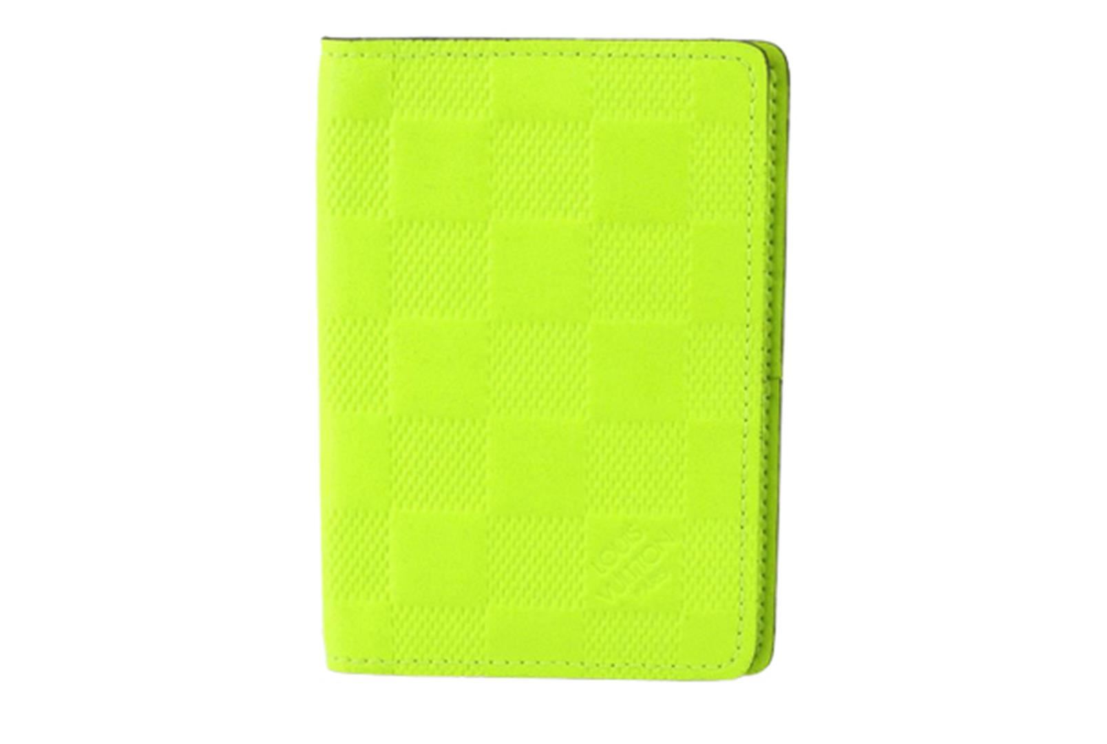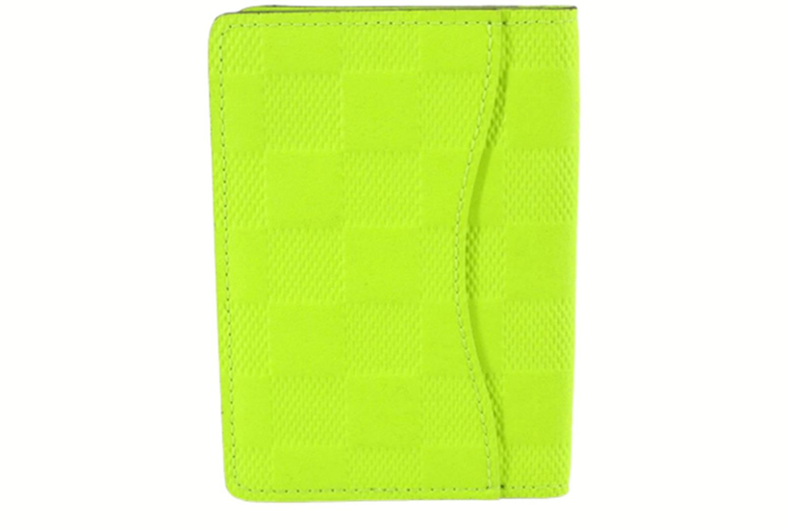 Men's fluorescent yellow Damier Infini leather Louis Vuitton Pocket Organizer with single exterior card slot, tonal leather interior, six interior card slots and flap closure at front. Height: 4.5" Width: 3" Depth: 0.25"