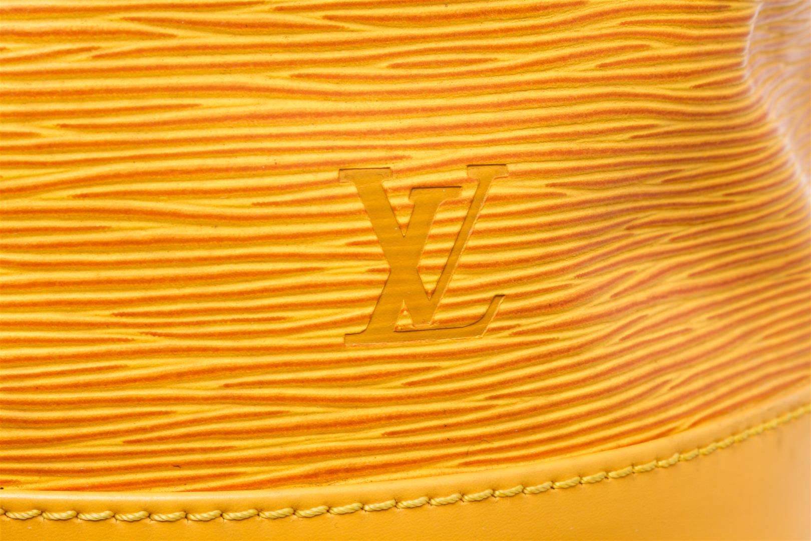 Louis Vuitton Yellow Leather Noe Shoulder Bag. All available information is listed in the description and shown in the photos. Louis Vuitton Yellow Leather Noe Shoulder Bag with yellow leather, brass hardware, single shoulder strap, alcantara lining, drawstring closure at top Height: 13" Width: 10.5" Depth: 7.5" Shoulder Strap Drop: 9" / Height: 33.02" Width: 26.67" Depth: 19.05" Shoulder Strap Drop: 22.86"