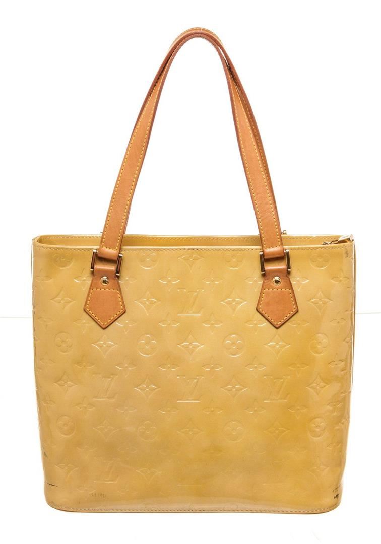 Louis Vuitton Yellow Monogram Canvas Houston Shoulder Bag vernis leather trimmed with tan leather and silver hardware. Top zipper closure opens to a black canvas lined interior that holds 1 zipped and 2 slit side pockets.