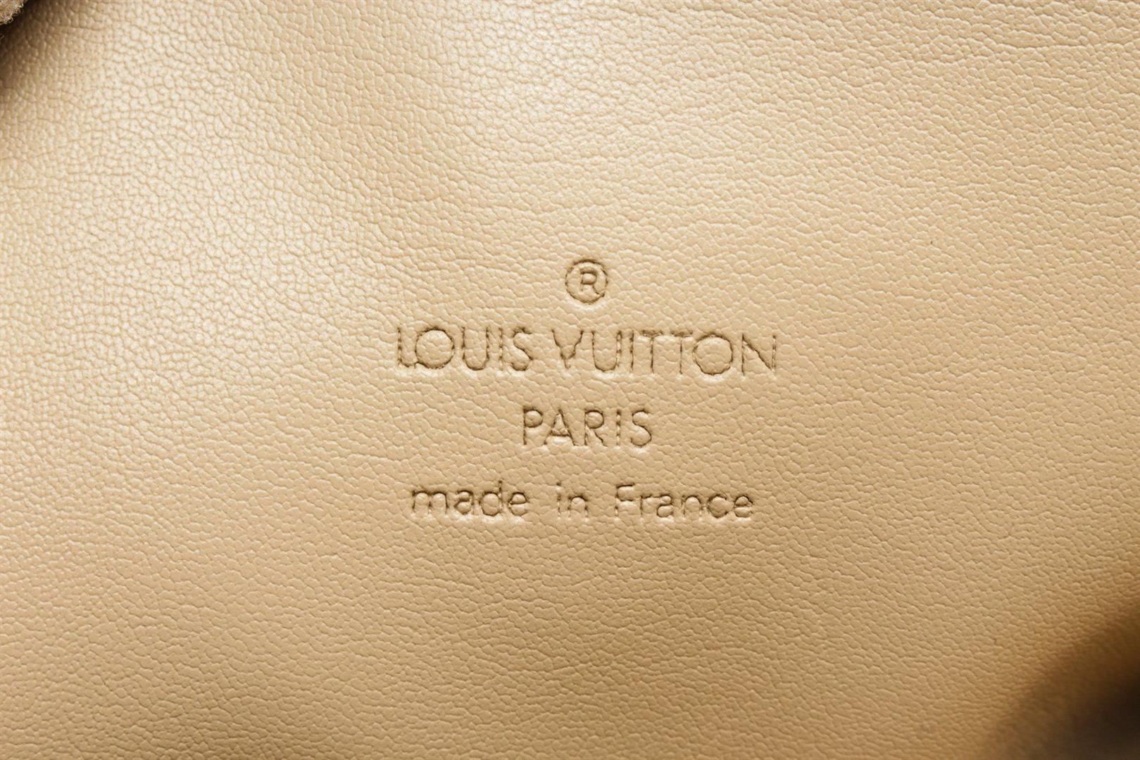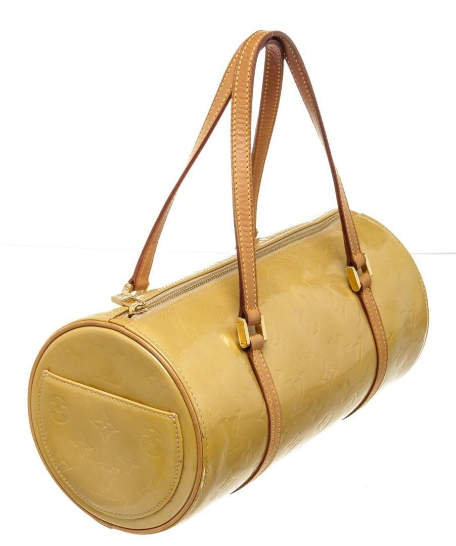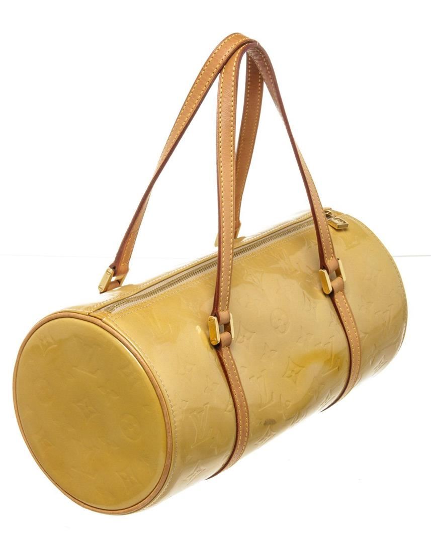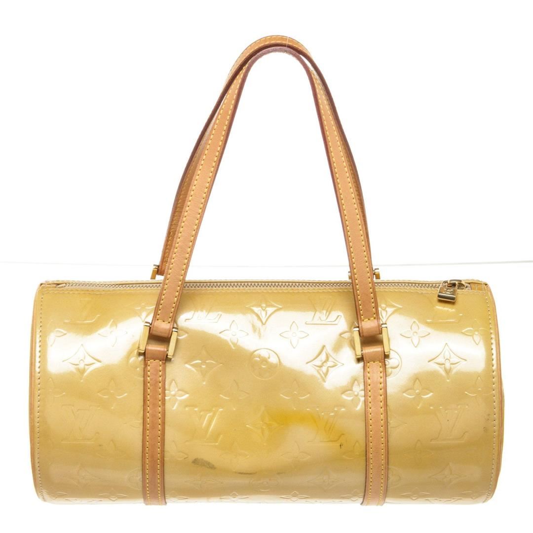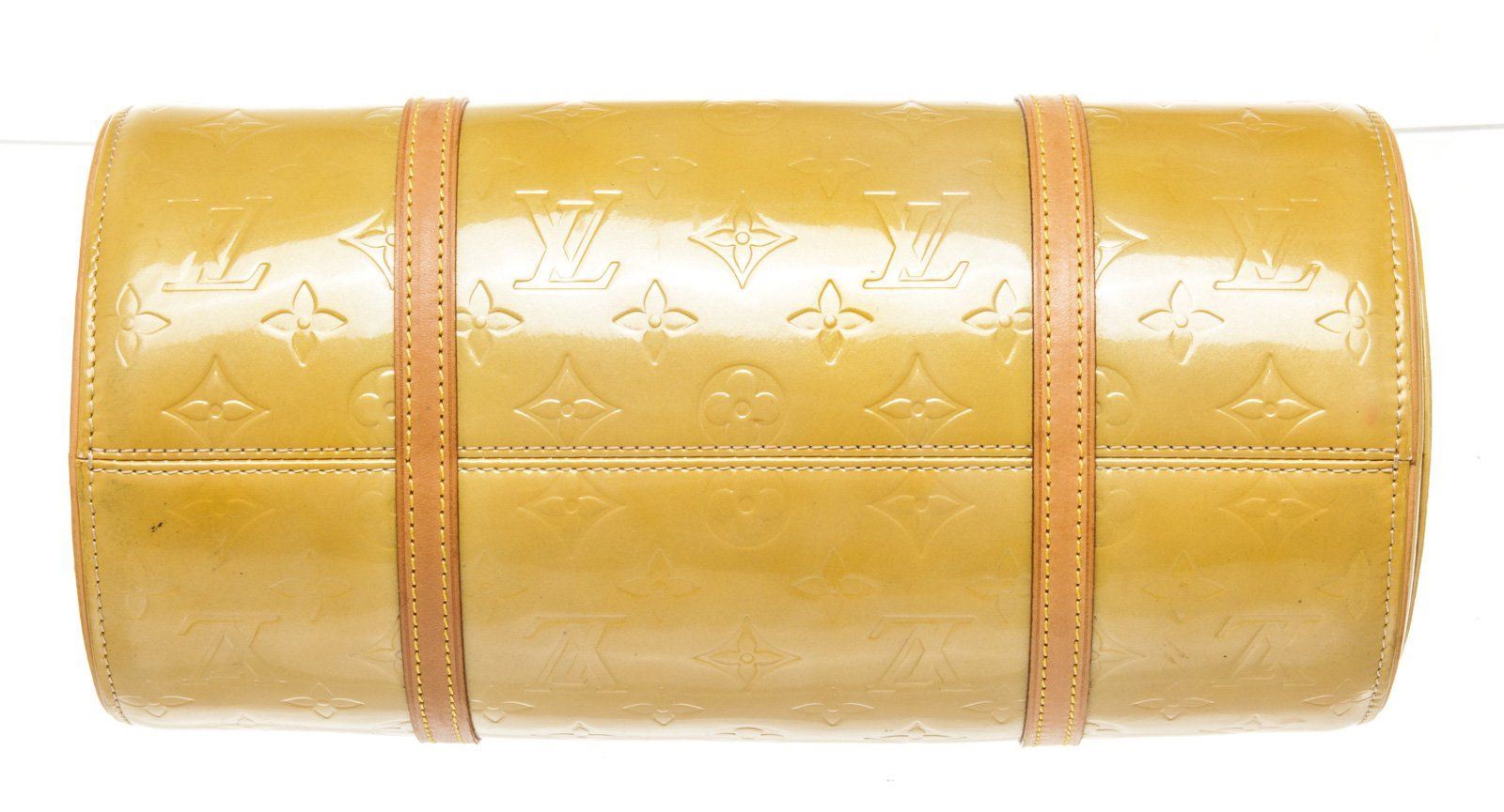 Louis Vuitton Yellow Monogram Vernis Bedford Handbag with vernis leather, gold-tone hardware, trim tan vachetta leather, leather lining, shoulder strap and zipper closure.
