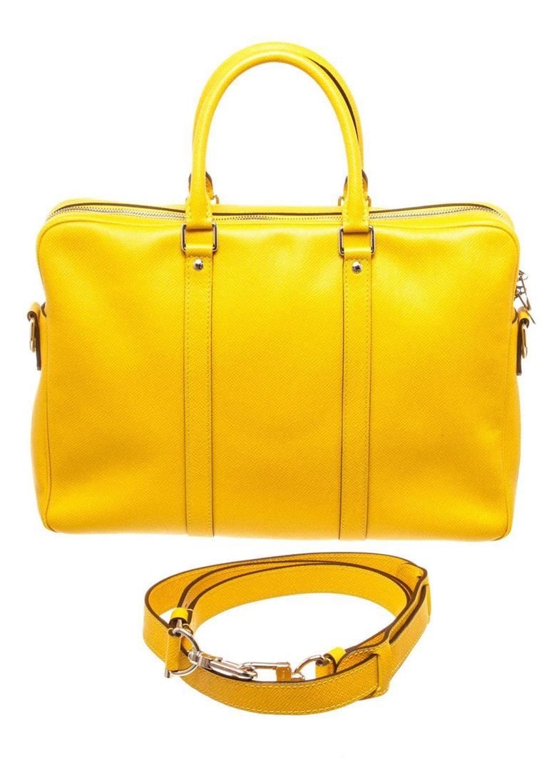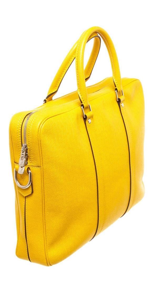 Louis Vuitton Yellow Porte Document Voyage Briefcases with leather gold-tone hardware, trim tan vachetta leather, interior three pocket, canvas lining, dual top handle and zipper closure.