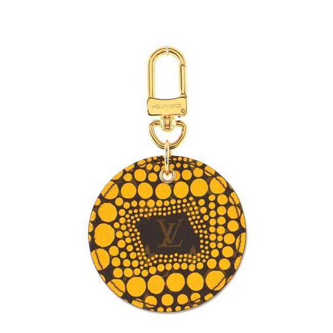 Louis Vuitton Yellow Yayoi Kusama Pumpkin Dots Monogram Limited Edition Round Key Holder features gold-tone hardware with canvas coated leather and yellow pumpkin dots as a signature pattern from artist Yayoi Kusama.