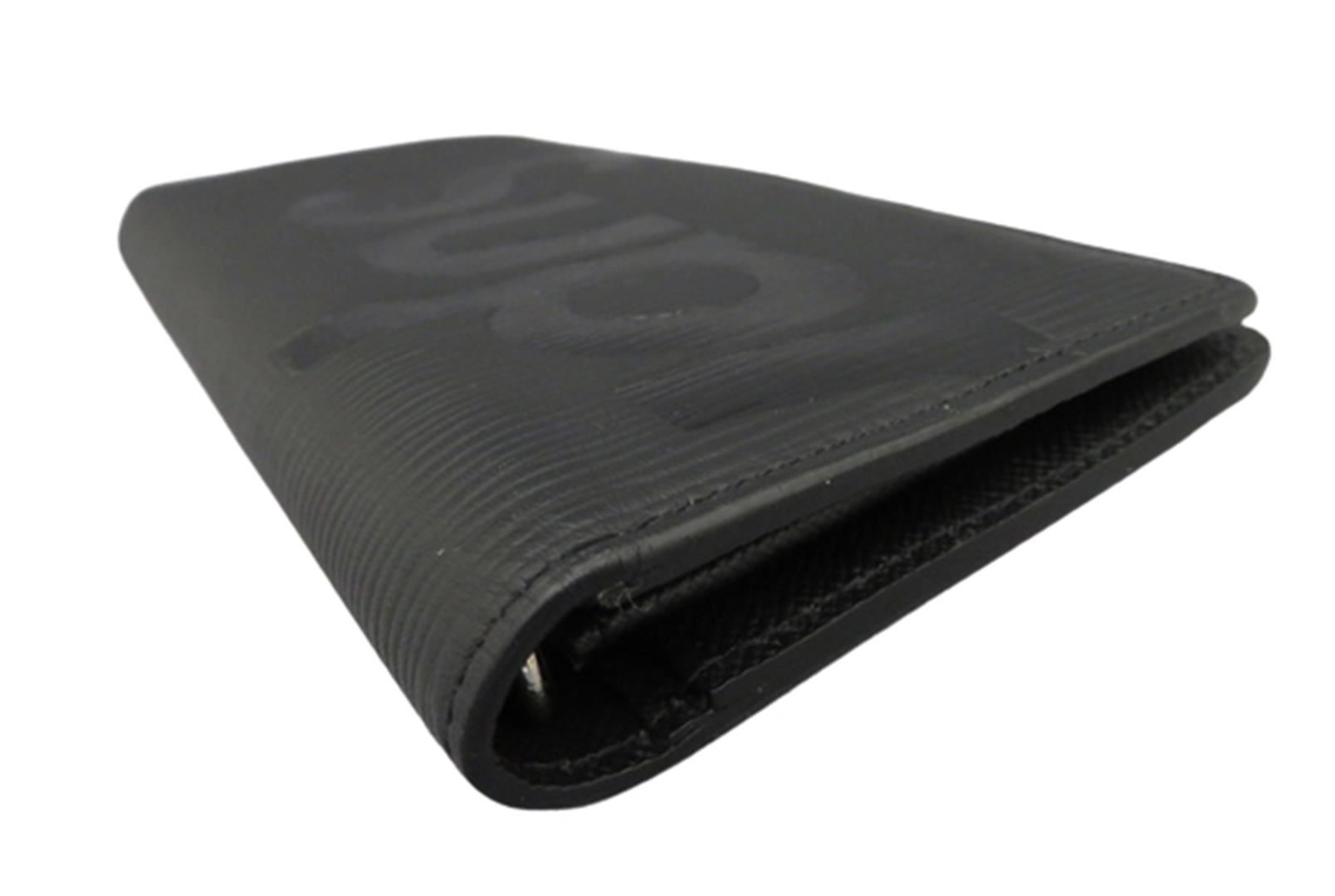 One Louis Vuitton x Supreme Black Epi Leather Brazza Wallet. Item is sold AS-IS. All available information is listed in the description and shown in the photo. Black Epi leather Louis Vuitton x Supreme Brazza wallet with silver-tone hardware, black Taiga leather lining, 16 credit card slots, large zipped compartment for coins and 4 inside flat compartments for bills and tickets. Height: 7.75" Width: 4" Depth: 0.5"