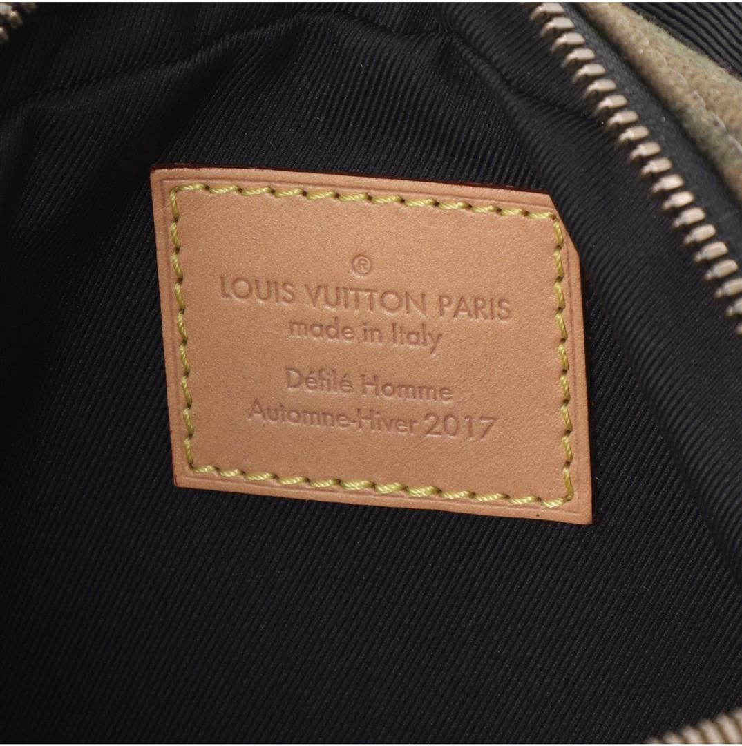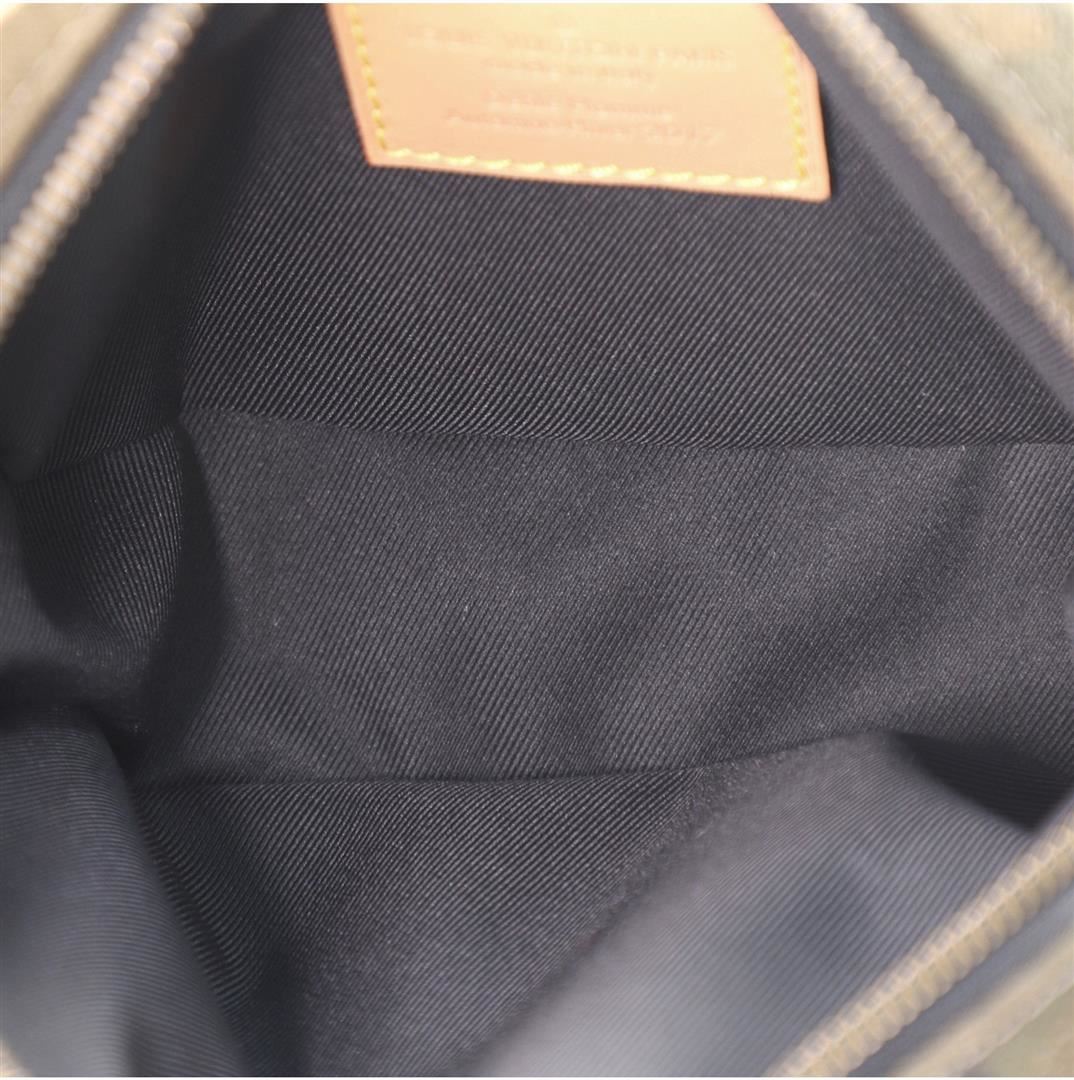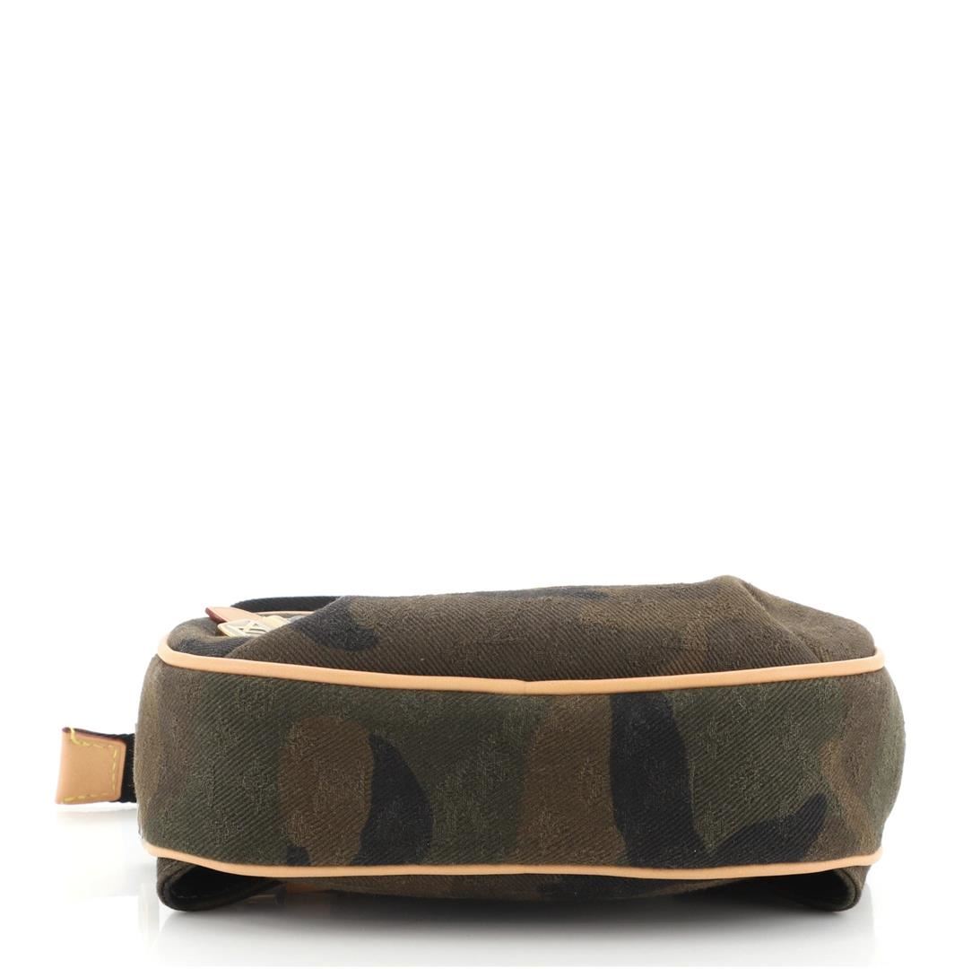 One Louis Vuitton x Supreme Green Camo Canvas Limited Edition Bum Bag. Item is sold AS-IS. All available information is listed in the description and shown in the photo. Louis Vuitton x Supreme Black Green Multicolor Camo Canvas Limited Edition Bum Bag features a thick camouflage woven canvas with jacquard LV monogram pattern, tan leather signature Supreme box logo label on front, tan leather trim with tan edging, Louis Vuitton logo engraved metal hardware, black web strap with woven Supreme and LV logos. Height 4.5", Width 7.5", Depth 2", Strap Drop 16.5-21"