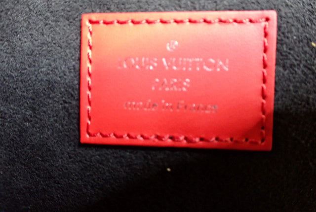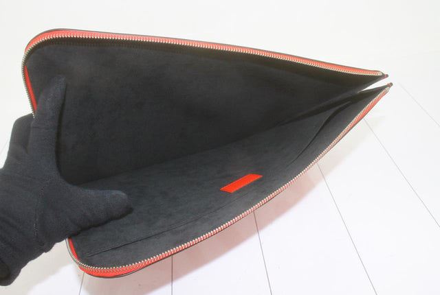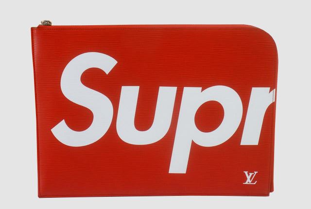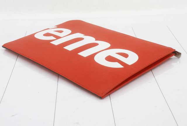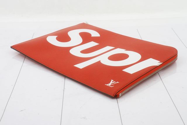 Red Epi Leather Louis Vuitton x Supreme Pochette Jour Limited Edition with silver-tone hardware, black cowhide-leather lining, interior slip pocket and L-zipper closure. eight 10", Width 13.5", Depth 1"