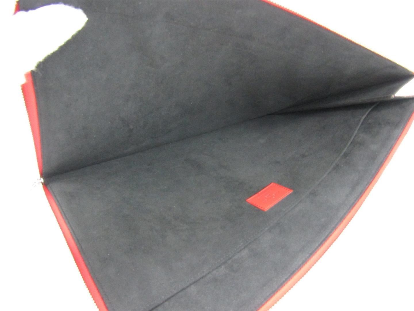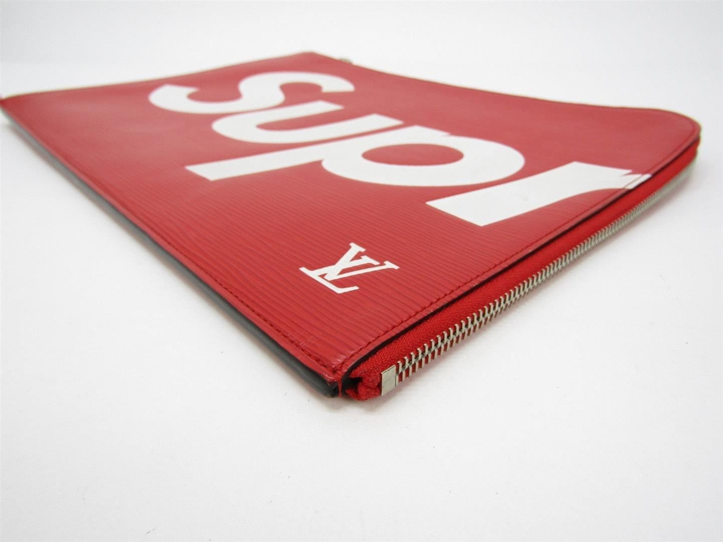 One Louis Vuitton x Supreme Red Epi Leather Pochette Jules GM Clutch Bag. Item is sold AS-IS. All available information is listed in the description and shown in the photo. Louis Vuitton x Supreme Red Epi Leather Pochette Jules GM Clutch Bag features an excellent storage capacity that features a wide opening with a silver-tone zipper opening and a clean gusset. 13.4" x 9.8" x 0.8" / 34cm x 25cm x 2cm