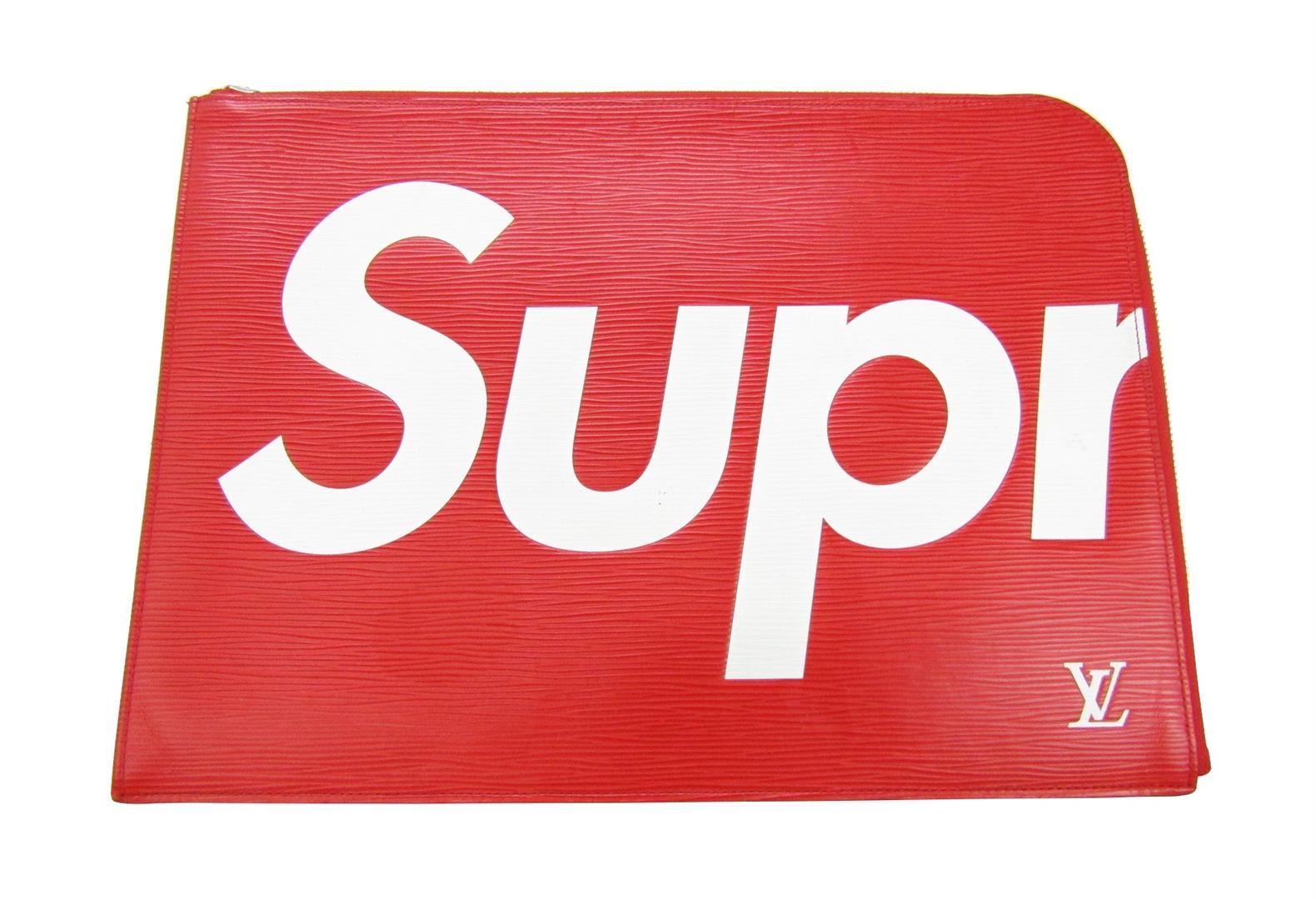 One Louis Vuitton x Supreme Red Epi Leather Pochette Jules GM Clutch Bag. Item is sold AS-IS. All available information is listed in the description and shown in the photo. Louis Vuitton x Supreme Red Epi Leather Pochette Jules GM Clutch Bag features an excellent storage capacity that features a wide opening with a silver-tone zipper opening and a clean gusset. 13.4" x 9.8" x 0.8" / 34cm x 25cm x 2cm