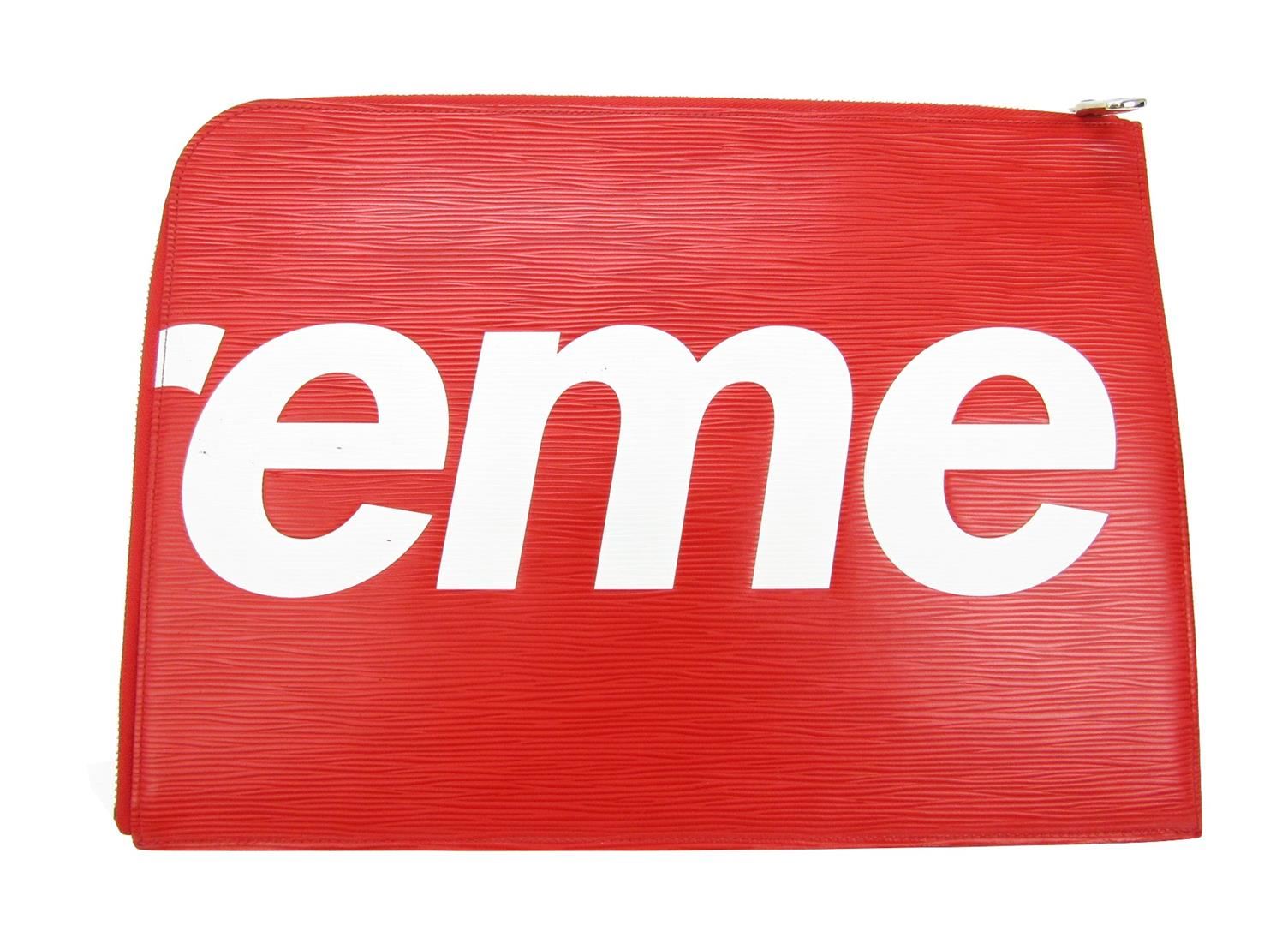 One Louis Vuitton x Supreme Red Epi Leather Pochette Jules GM Clutch Bag. Item is sold AS-IS. All available information is listed in the description and shown in the photo. Louis Vuitton x Supreme Red Epi Leather Pochette Jules GM Clutch Bag features an excellent storage capacity that features a wide opening with a silver-tone zipper opening and a clean gusset. 13.4" x 9.8" x 0.8" / 34cm x 25cm x 2cm