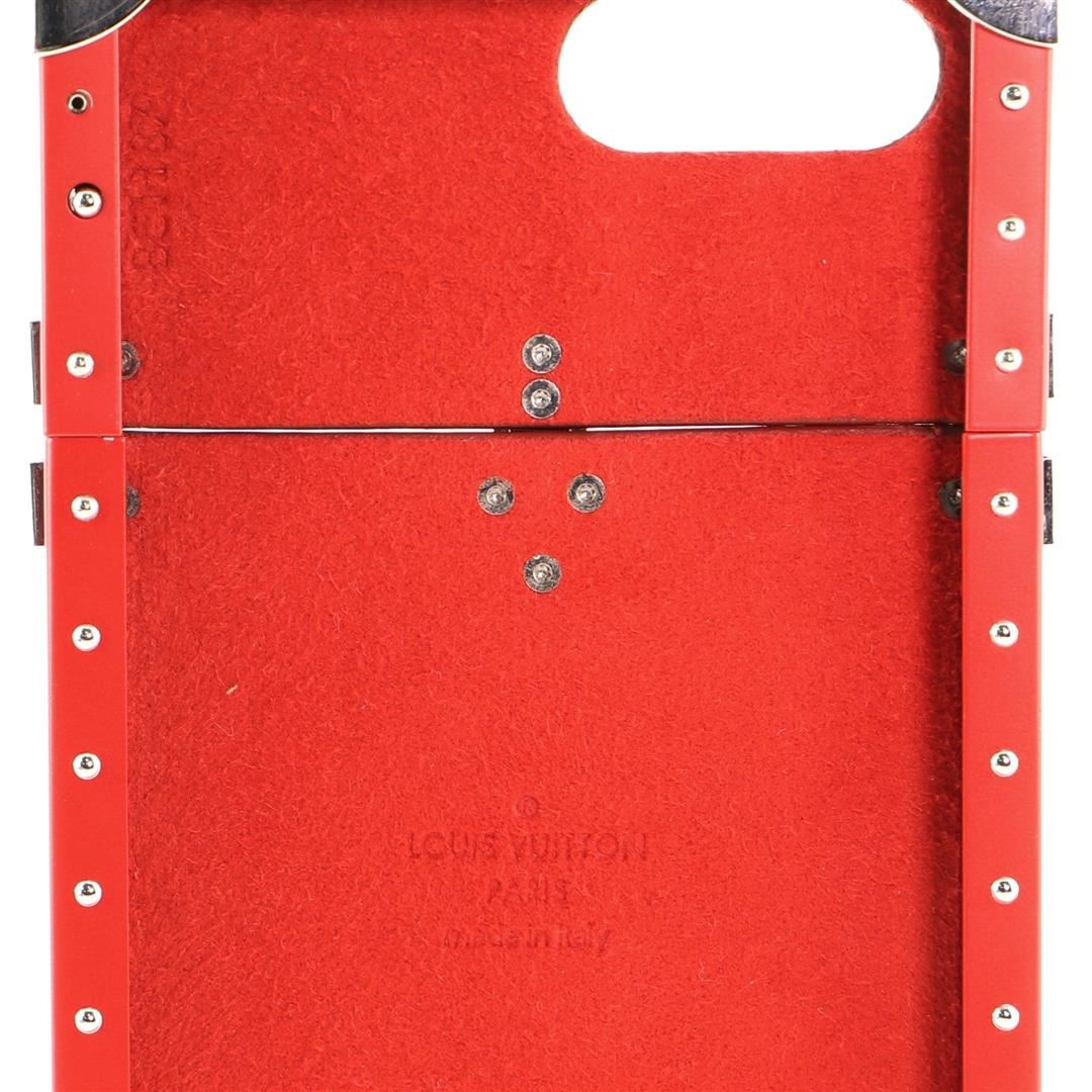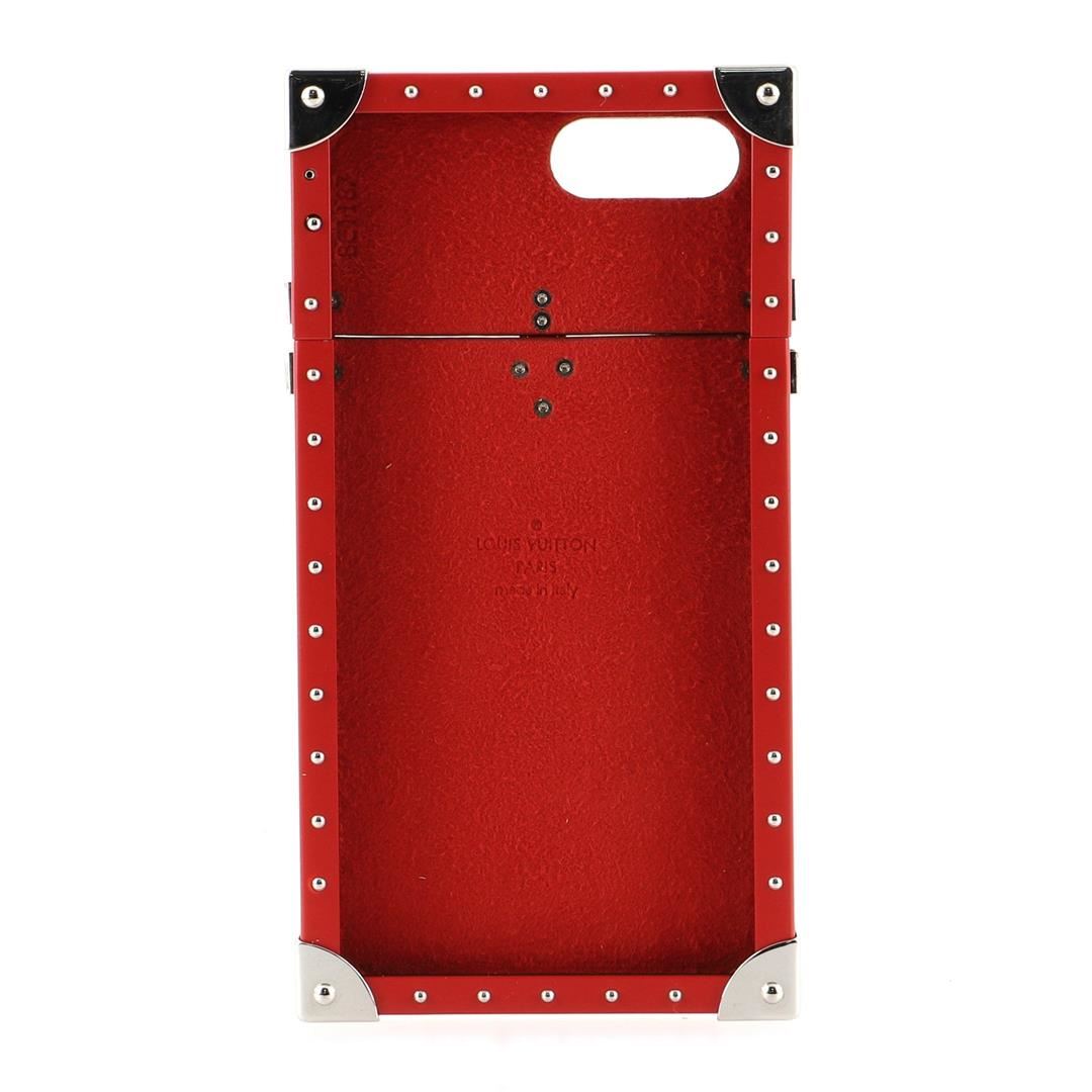 The case holds an iPhone 7 perfectly with a red microfiber interior and has shiny golden color metal pieces, adorned with the LV and Supreme logo in white and further accentuated with silver-tone hardware.