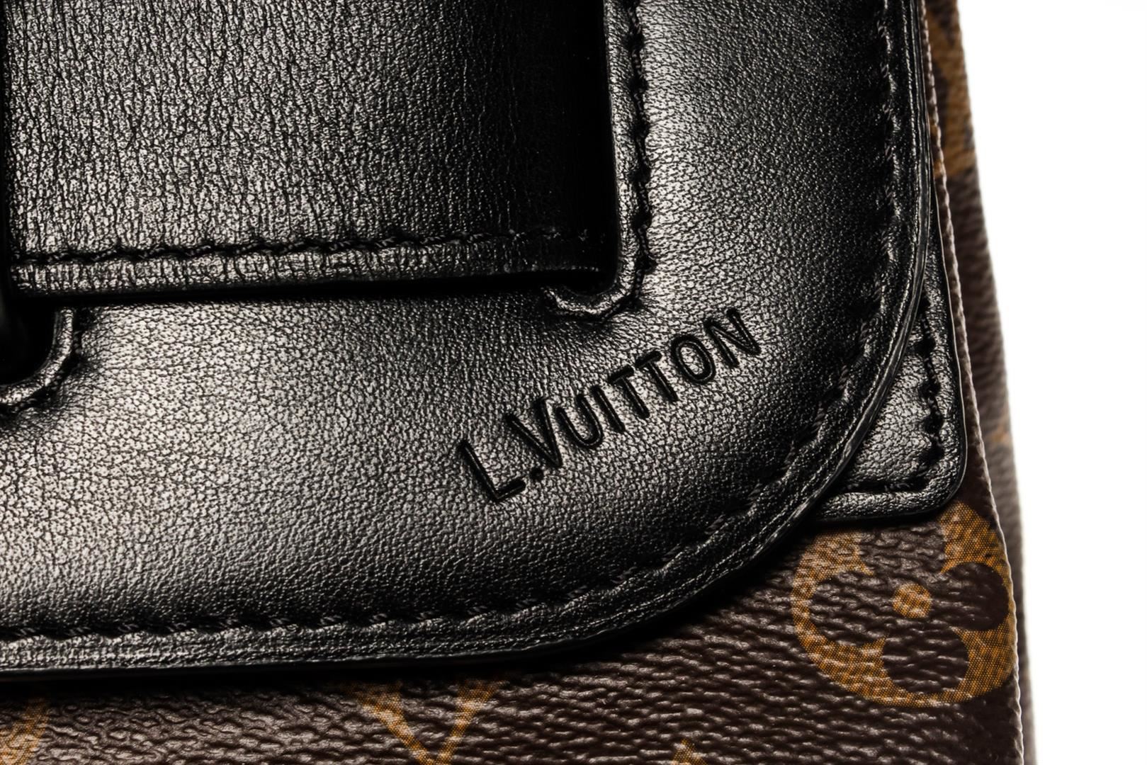 Brown monogram Macassar coated canvas Louis Vuitton x Virgil Abloh Solar Steamer PM bag with black-colored hardware, black leather trim, orange chain-link accent, single rolled handle, single exterior pocket with zip closure, black canvas lining & three i