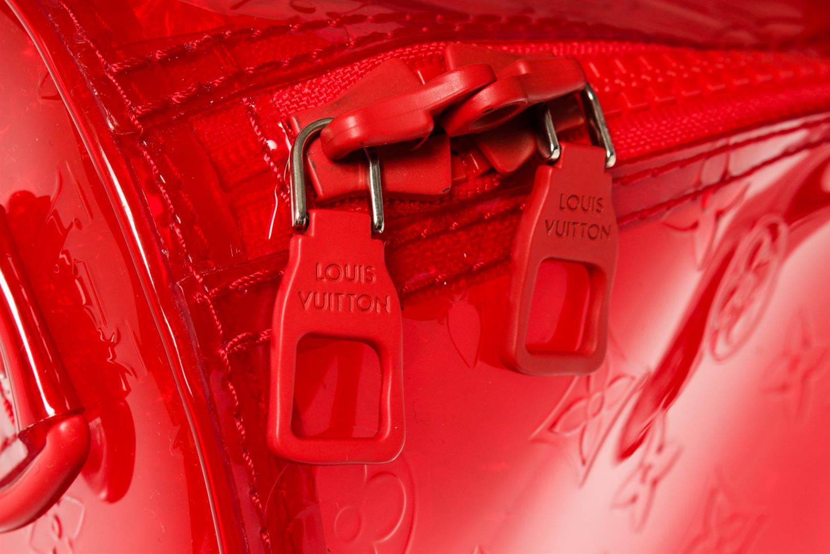 Men's red monogram PVC Louis Vuitton RGB Keepall Bandouliere 50 with multi-tonal hardware, detachable flat shoulder strap, dual rolled top handles, chain-link accent at side, tonal PVC interior and two-way zip closure at top. Height: 14" Width: 20" Dep