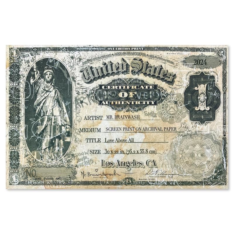 Love Above All is a limited edition silk screen print on paper by Mr Brainwash. The piece is hand signed and thumb-printed by the artist. The piece comes custom framed and with a Certificate of Authenticity. Measures approximately 42 x 34 (framed), 30 x 22 (image).