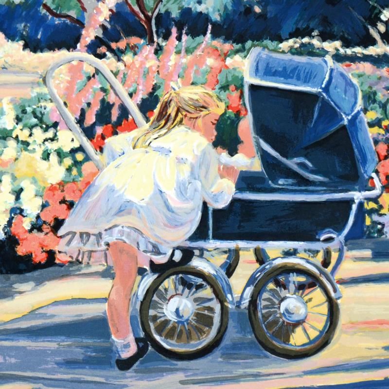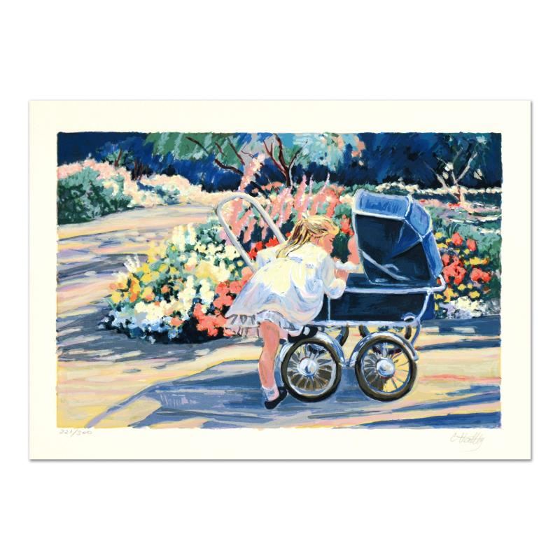 "Loving Moment" is a limited edition lithograph on paper by Corinne Hartley, numbered and hand signed by the artist! Measures approx. 16" x 11" (border), 14" x 9" (image).