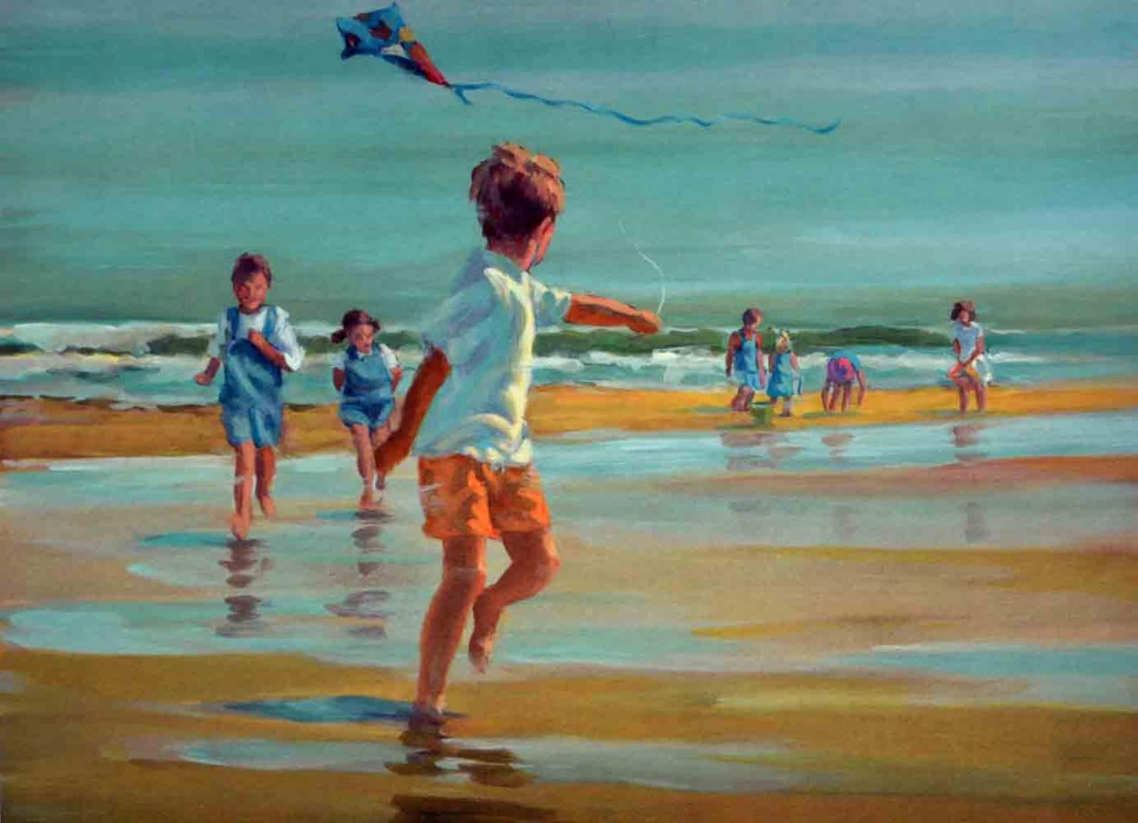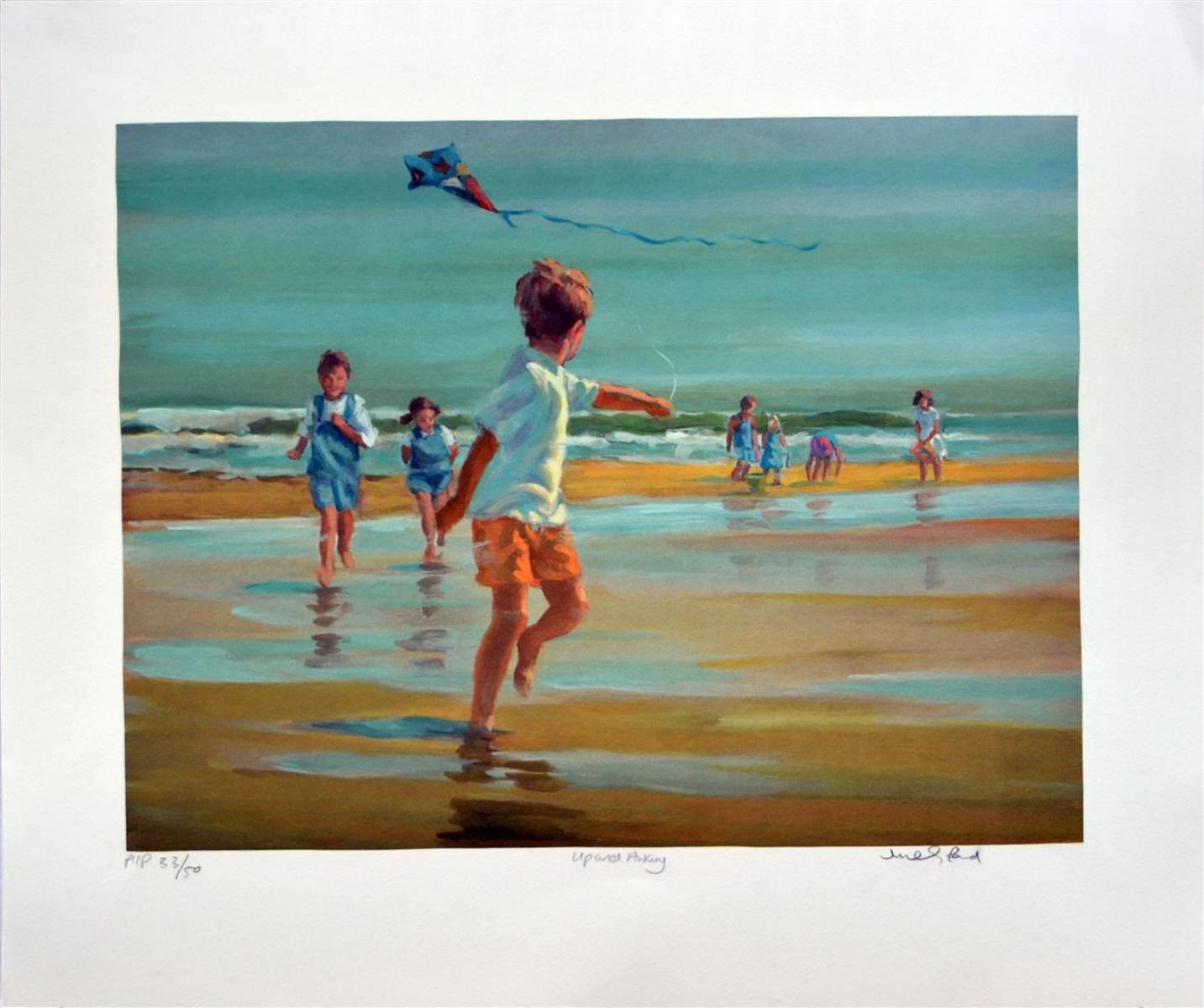 Artist: Lucelle Raad (b. 1942) - Title: Up Up and Away - Medium: Serigraph on Fine Art Paper - Signature: Hand-signed by the Artist - Limited Edition: AP 50 - Image Size: Approximately 13.5 Inches x 18 inches - Paper Size: Approximately 18.5 inches x 22.5 inches - Unframed - Details: This work comes with a Certificate of Authenticity - Biography: Many are touched by Lucelle's blending of the hopeful innocence of children in a commonplace setting. Each case awakens nostalgia for that youthful honesty and simplicity in all that view her work. The recipient of multiple awards, her most prized award was received at the world famous Washington Square Art Exhibit, an annual event in New York which is an invitational, juried show with over 500 artists from every corner of the globe. Lucelle's art graces many corporate, public, and private collections in every state in the union and in countries around the world.