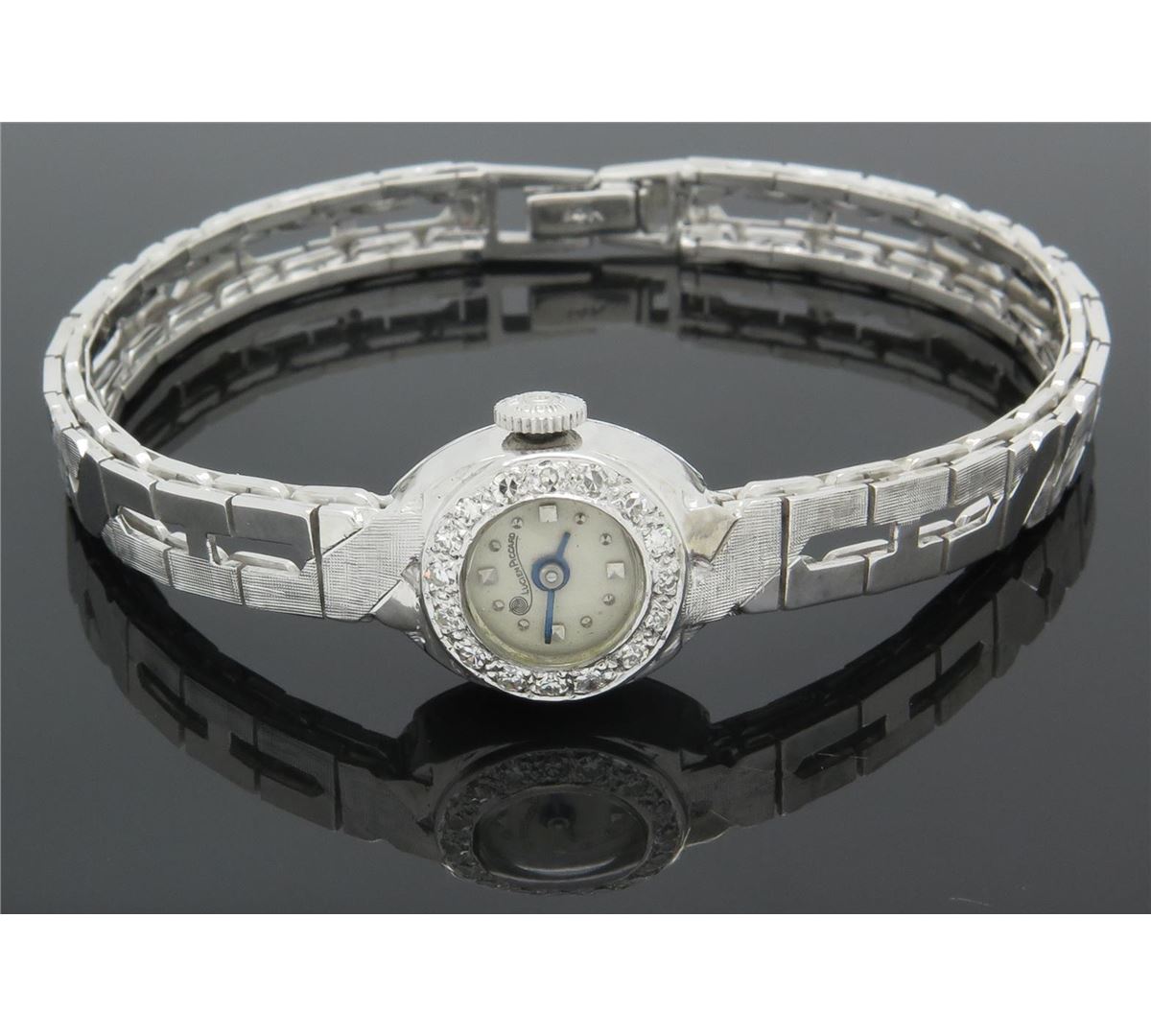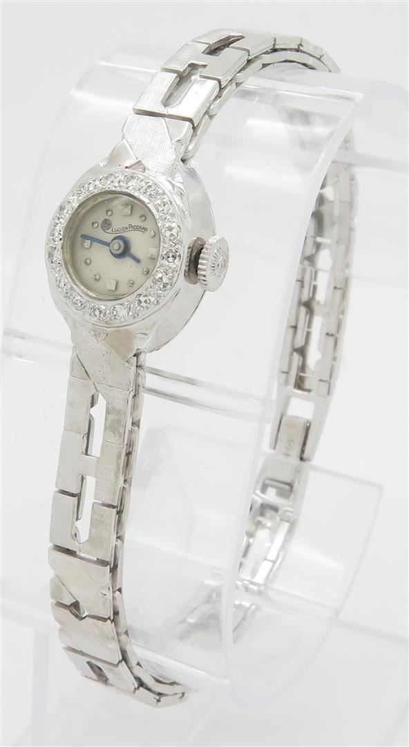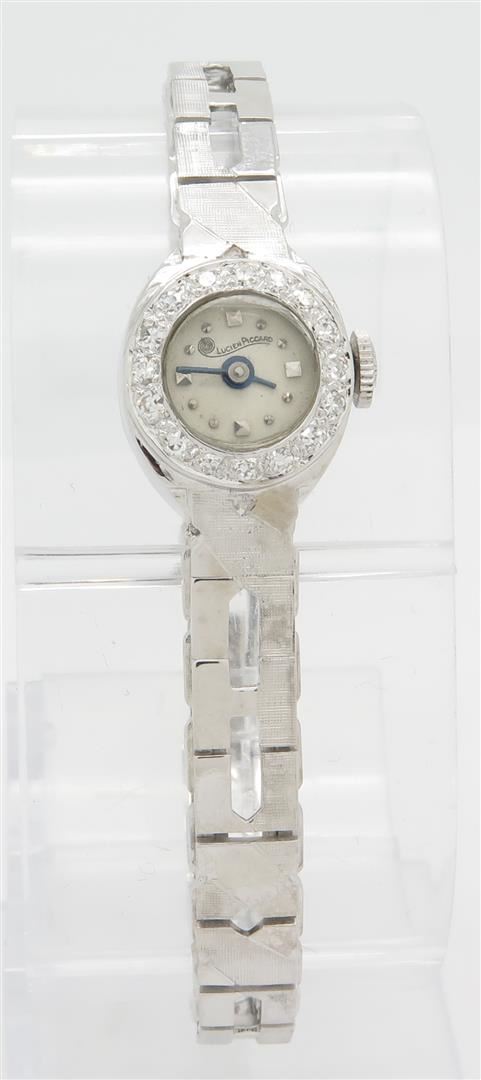 One tested gold Lucien Piccard Watch. The watch case is 18K white gold and the band is 14K white gold. Containing: 16 Single Cut Diamonds. Clarity: VS-SI, Color: G-H. Approximate total diamond weight: .25CTW. All diamonds are graded in the mounting unless otherwise stated. Weight of watch: 23.7 grams, Size: 6.5". The back of the case reads 18K Lucien Piccard cased and timed in U.S.A. 33611. The original box is included.