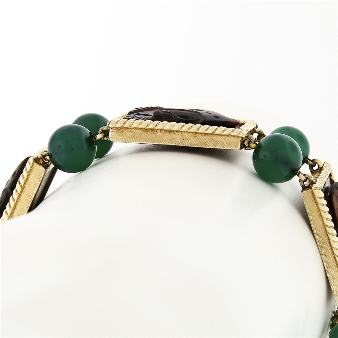 A designer solid 14k yellow gold bracelet by Lucien Piccard, 5 carved rectangular shape natural tiger's eye (19.25x14.75mm ), and 12 round bead natural chalcedony (7.9-8.0mm). It weighs a total of 44.11 grams, measures 18.2mm wide, and measures 6.5 inches in length.