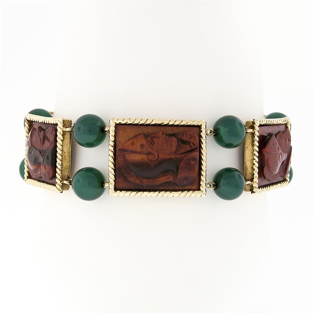 A designer solid 14k yellow gold bracelet by Lucien Piccard, 5 carved rectangular shape natural tiger's eye (19.25x14.75mm ), and 12 round bead natural chalcedony (7.9-8.0mm). It weighs a total of 44.11 grams, measures 18.2mm wide, and measures 6.5 inches in length.