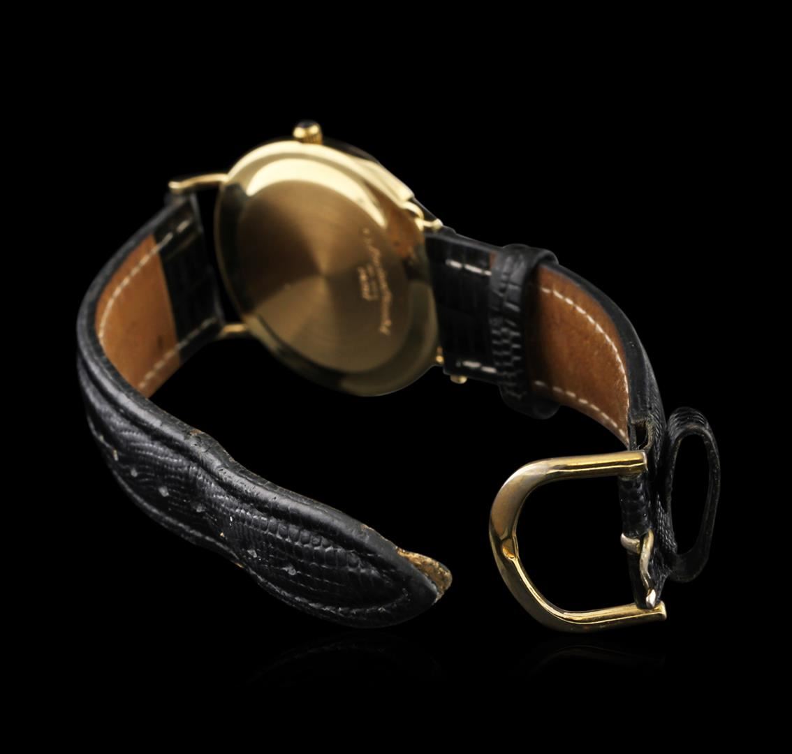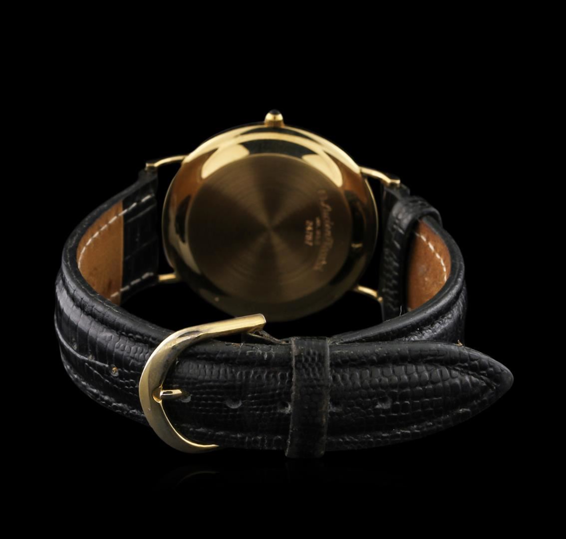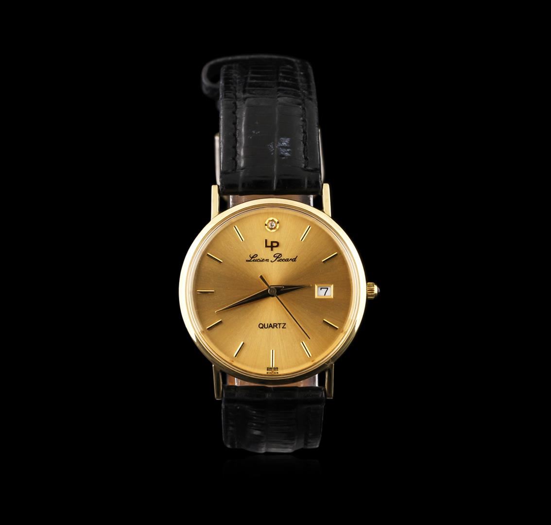 One Lucien Piccard 14KT Yellow Gold 24787 Men's Watch featuring: Movement: Swiss quartz. Case: 14KT yellow gold. Case Shape: Round. Crown: Pull/push. Dial: Gold tone color with gold tone hour, minute, and second hands. Date window located at the 3 o'clock position. Bracelet: Genuine black leather.