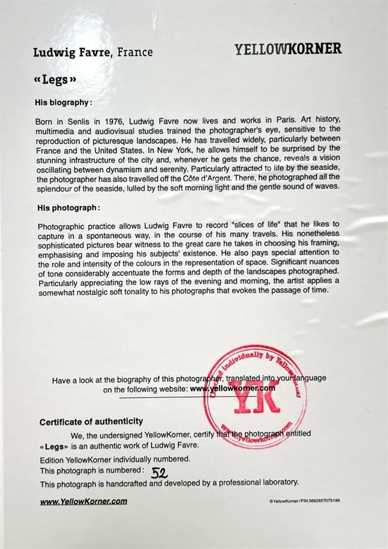 Ludwing Favre France Legs YellowKorner Certified Photograph. Certificate of Authenticity from YellowKorner affixed to the back. Matted Dimensions 16"x20". Protected with Clear Mylar Sleeve.