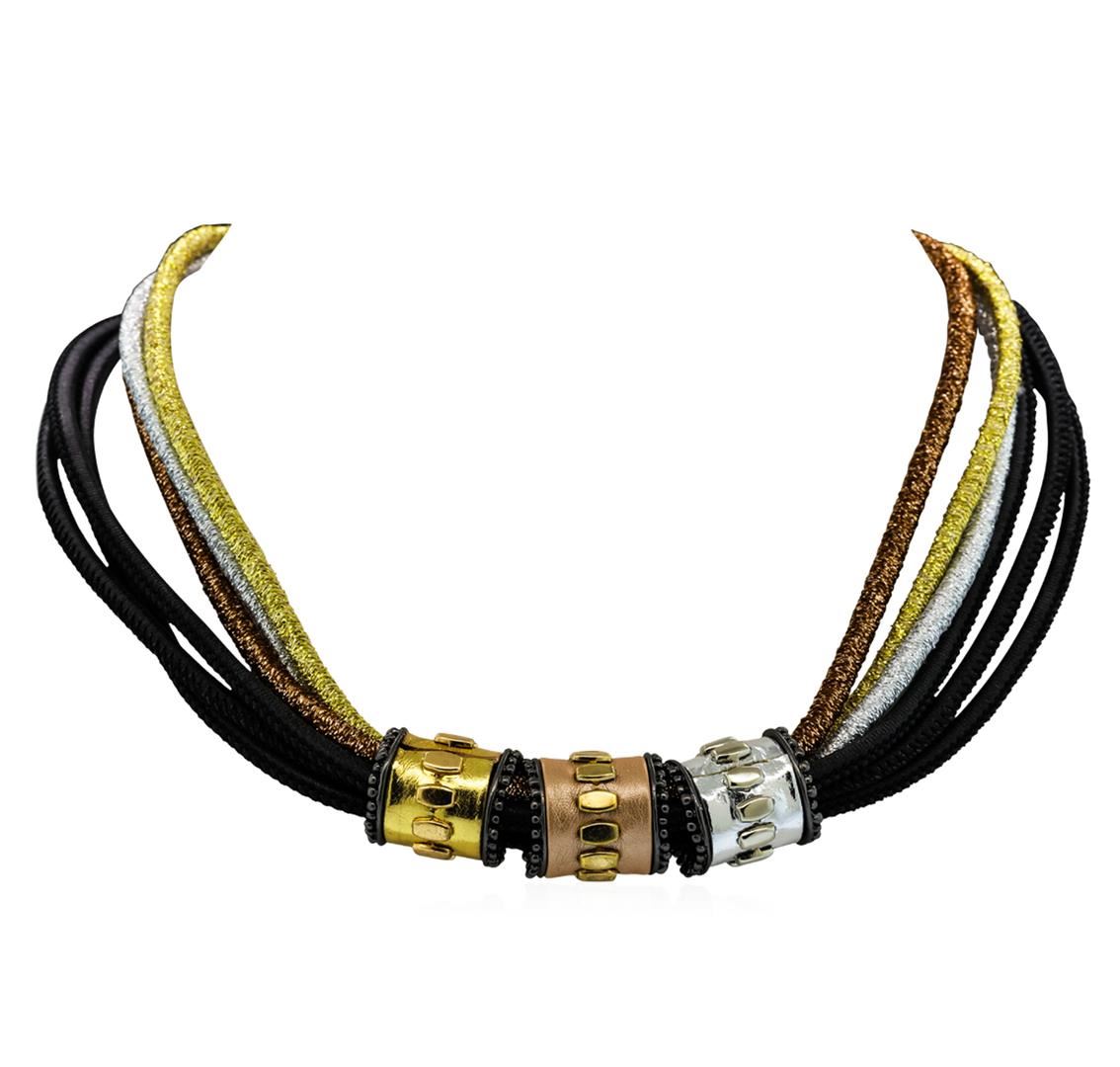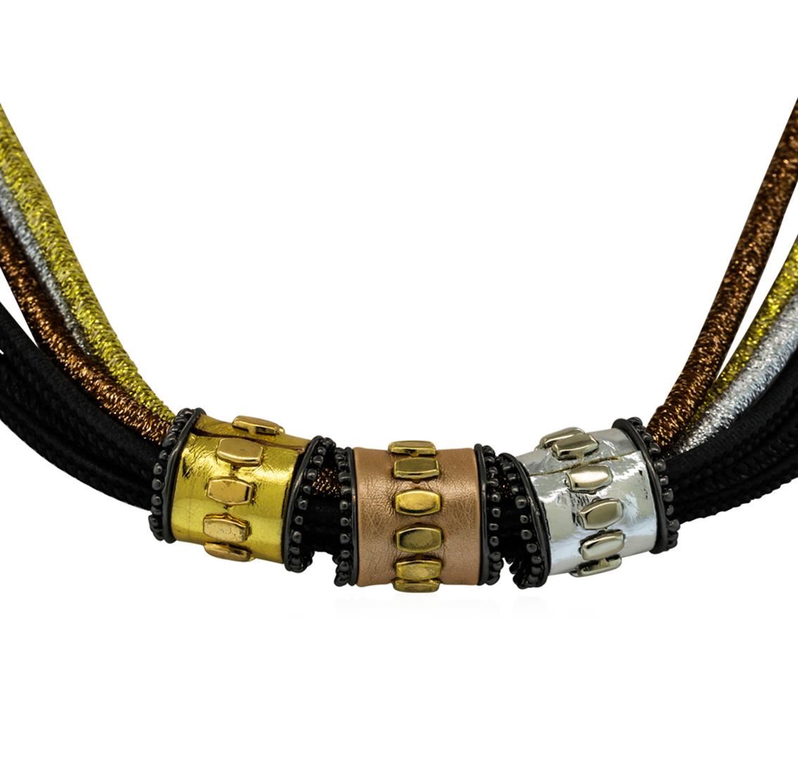High end designer jewelry. Lurex Cord Necklace - Gold Plated. Gold Plated Metal/3" Ext Clasp. Multi/ Gold. 18inches.