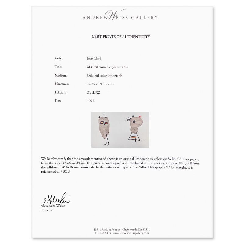 "M. 1018 from L'enfance d'Ubu" is a limited edition lithograph on Velin Arches paper. This piece is hand signed by Joan Miro (1893-1983). The suite portfolio that this piece comes from is numbered but the piece itself is not numbered. This piece comes custom framed. Includes Certificate of Authenticity. Measures approx. 31" x 24" (frame), 19.5" x 12.5" (image).