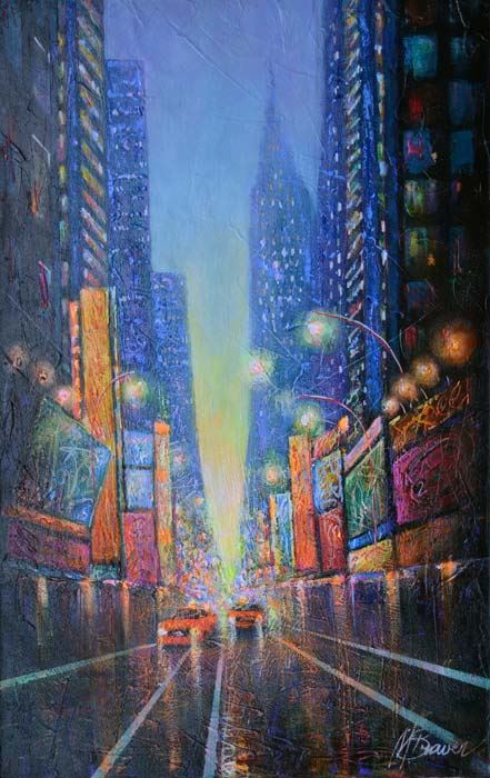 M. BRAVER **TIME SQUARE ** SIGNED ORIGINAL ACRYLIC . Artist: Mark Braver (b. 1958) - Title: Time Square - Medium: Original Acrylic on Canvas - Signature: This one-of-a-kind work is hand-signed by the artist at the bottom of the image - Image Size: Approximately 24 inches x 16 inches - Framed: Unframed on Unstretched Canvas - Details: This work comes with a Certificate of Authenticity - Biography: Braver was born in Riga, the capital of Latvia in 1958. Like many young artists of his time, he spent three years in a 'School of Fine Art', but had to discontinue his artistic persuasion when he was drafted to the Red Army. Mark Braver's artwork is unique in its vivid colors and special textures. - His compositions come to life on the canvas in an abundance of colors while his unique layering and texturing techniques lend the paintings an unusual quality. Mark's work has caught the attention of many a collector and it may now be found in private collections in the United States, Europe and Israel. - Warranty: Item GUARANTEED to be as described