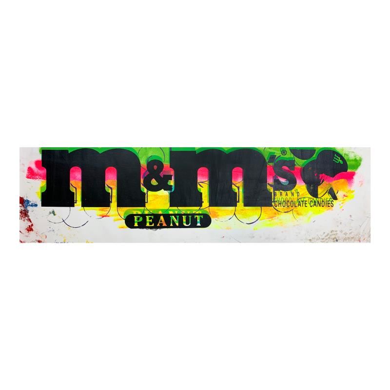"M&Ms Peanut Candy " is limited edition hand pulled silkscreen unique mixed media on canvas by Andy Warhol protege Steve Kaufman (1960-2010). This piece is numbered and hand signed inverso and includes a letter of authenticity. As is common with Kaufman's works, this piece may have perceived minor flaws, but is in overall good condition. Measures approximately 14" x 49" before cropping.