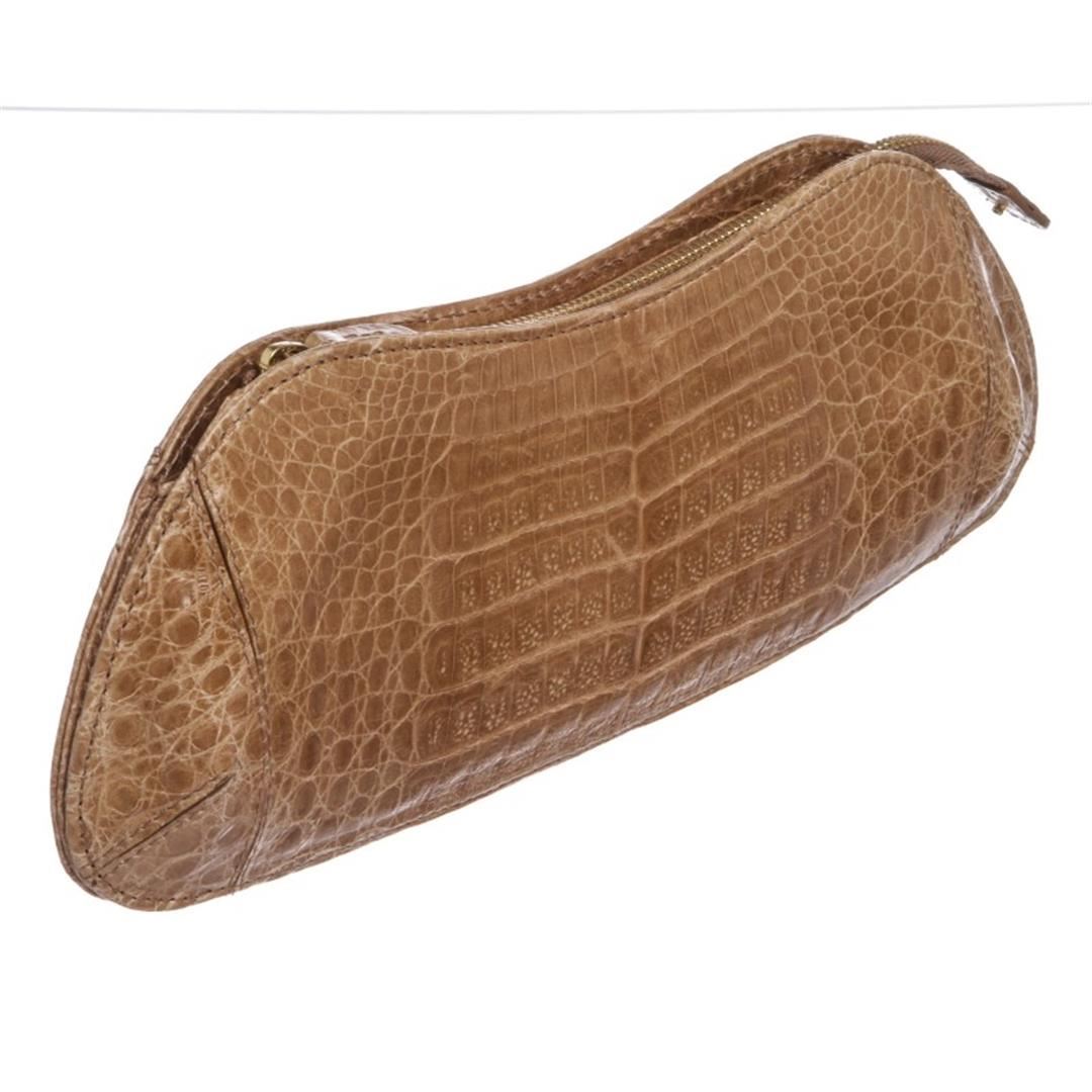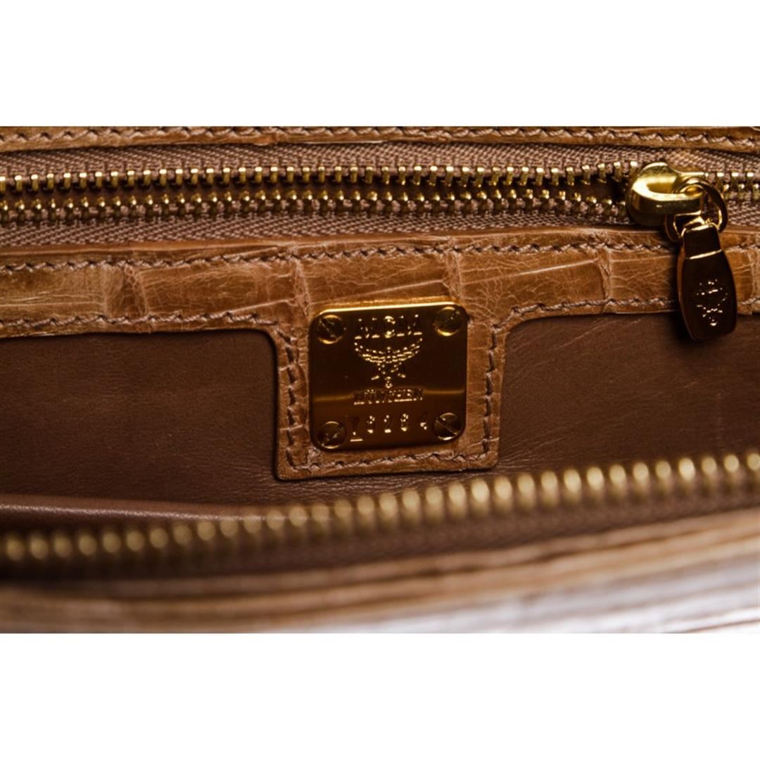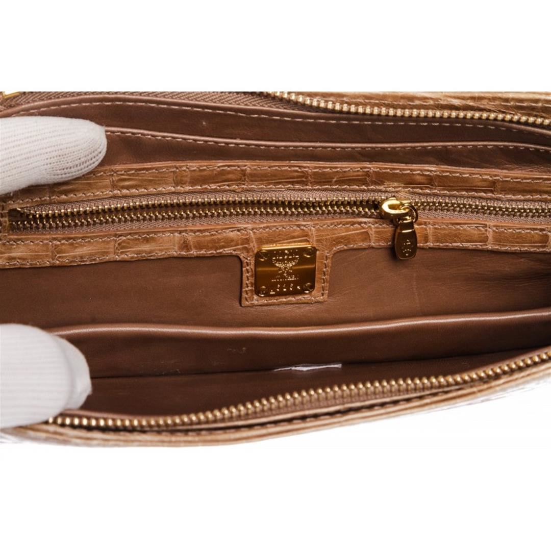 Beige crocodile MCM evening clutch with gold tone hardware, leather interior lining, zipper pocket at interior wall and a overall zipper closure. Item is Pre-Owned.