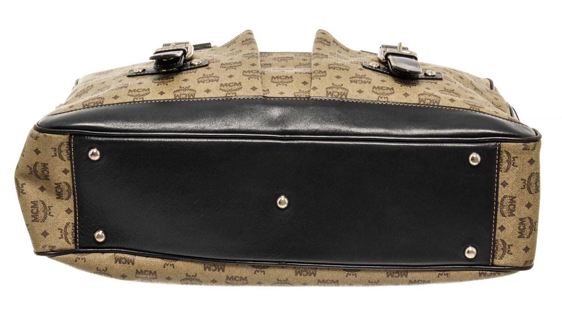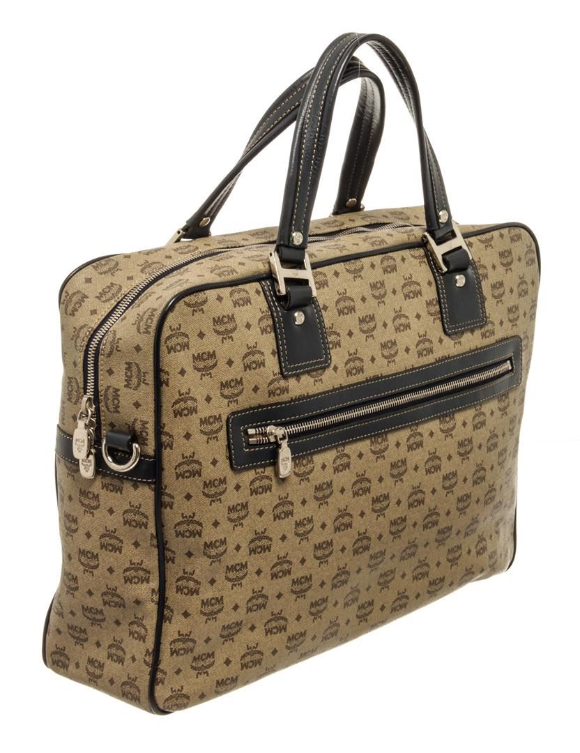 One MCM Beige Leather Visetos Tote Bag. Item is sold AS-IS. All available information is listed in the description and shown in the photo. MCM Beige Leather Visetos Tote Bag with dark brown leather trim, gold-tone hardware, a two-way zip closure safely secures your laptop, tablet, and documents inside, the dark brown jacquard logo canvas lining and three main compartments with one zipped pocket and two slip pockets. 10"L x 13"W x 3.5"H / 25.4 x 33.02 x 8.89 Cm