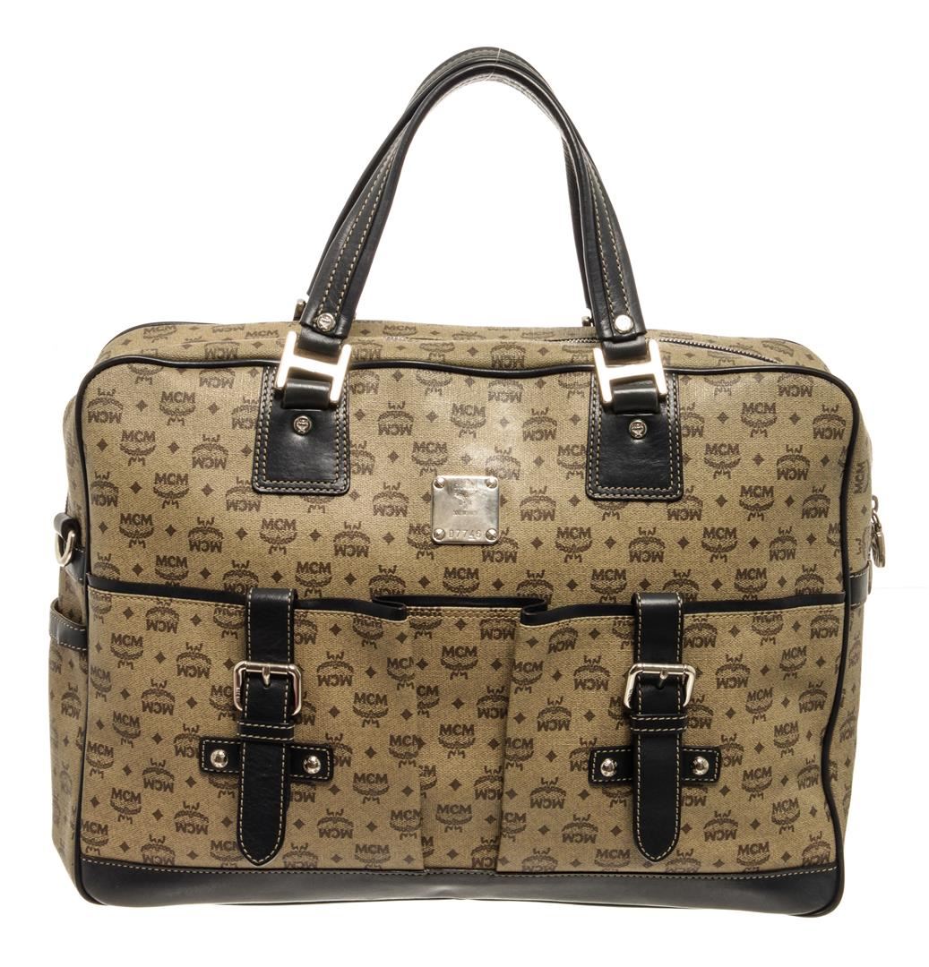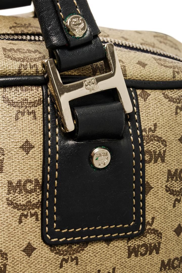 One MCM Beige Leather Visetos Tote Bag. Item is sold AS-IS. All available information is listed in the description and shown in the photo. MCM Beige Leather Visetos Tote Bag with dark brown leather trim, gold-tone hardware, a two-way zip closure safely secures your laptop, tablet, and documents inside, the dark brown jacquard logo canvas lining and three main compartments with one zipped pocket and two slip pockets. 10"L x 13"W x 3.5"H / 25.4 x 33.02 x 8.89 Cm