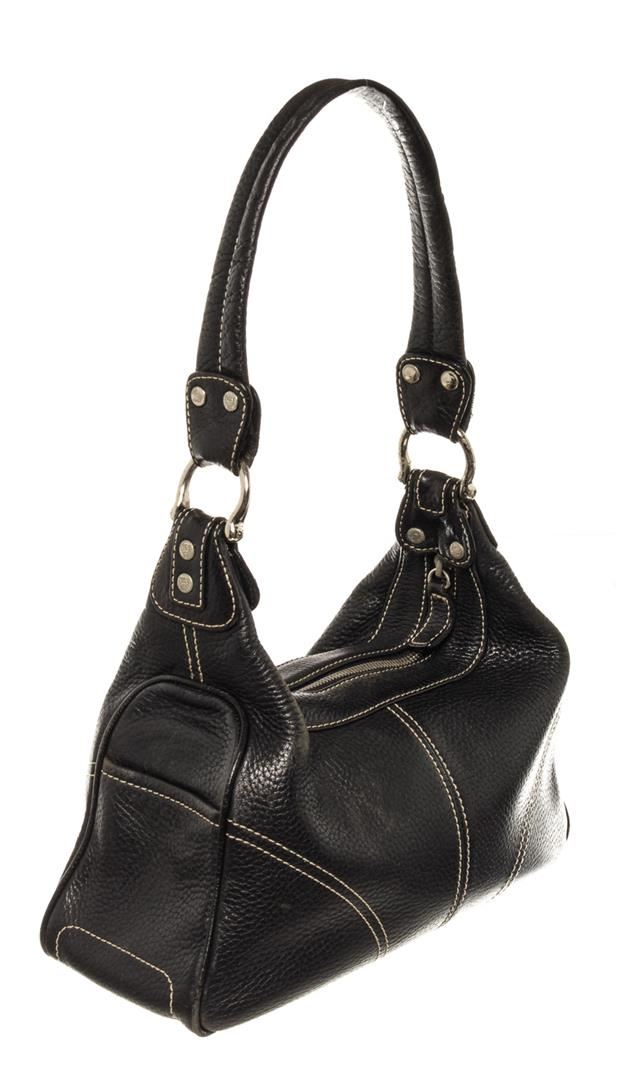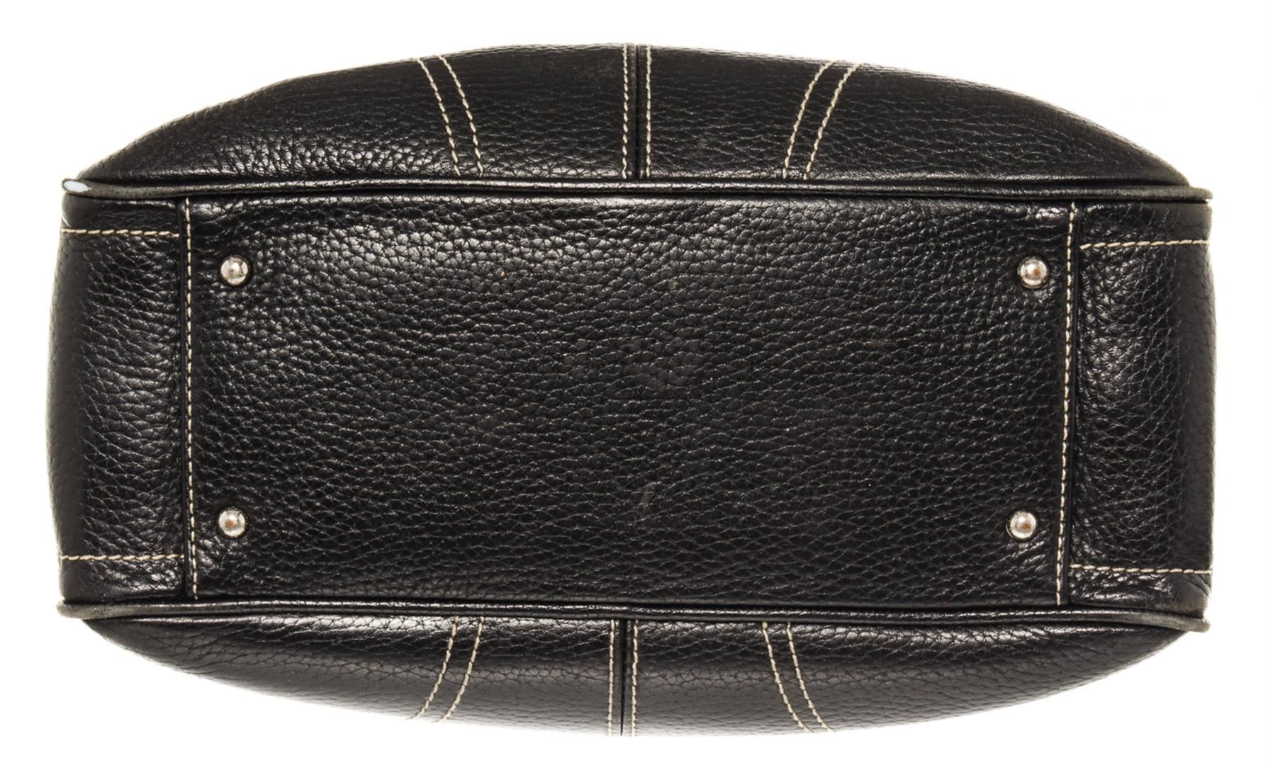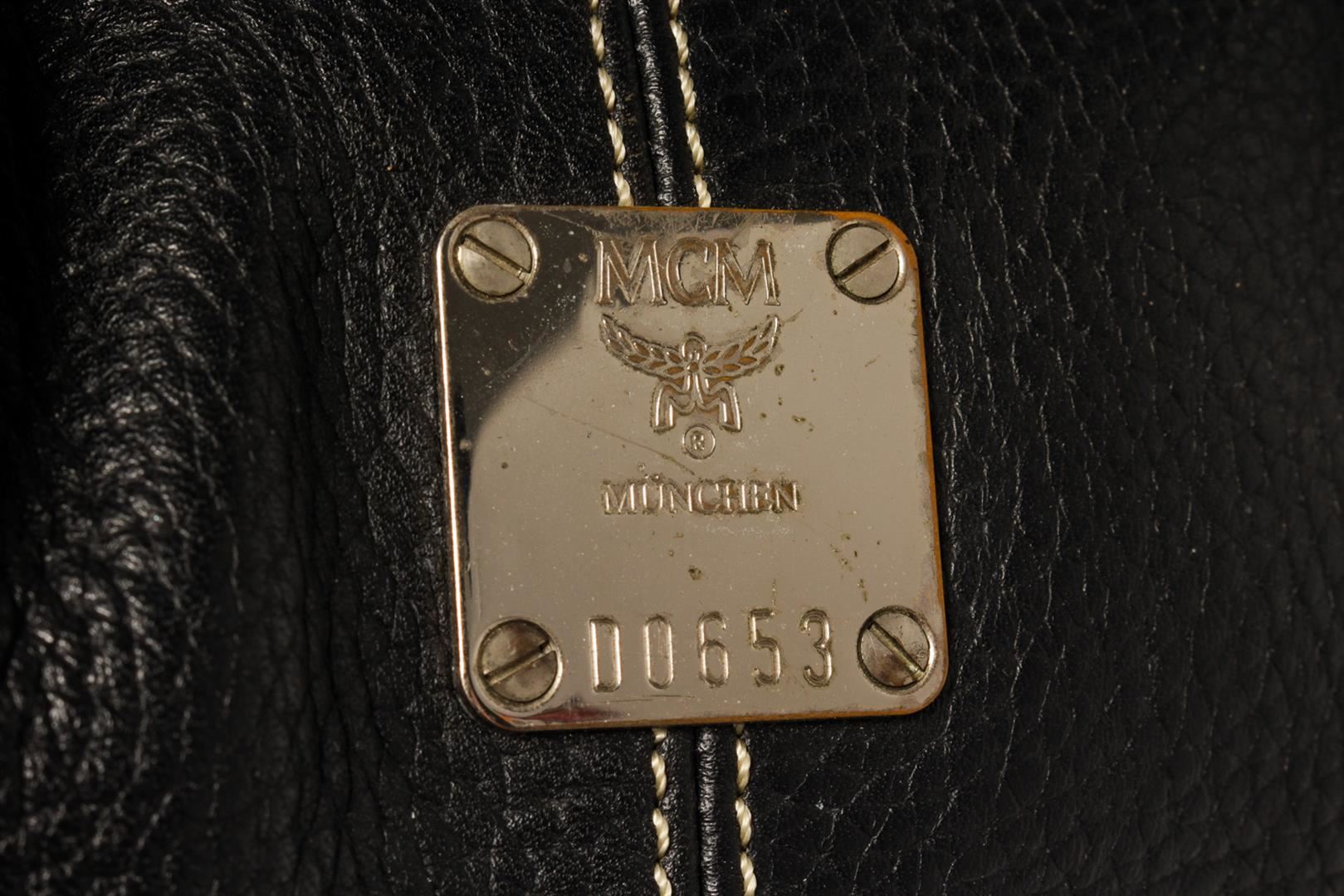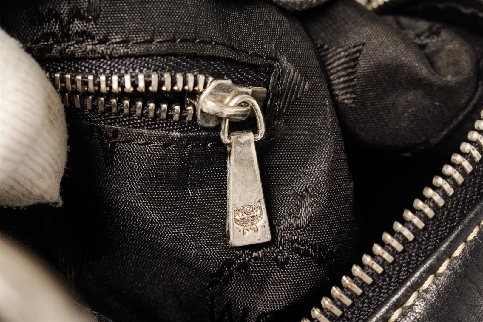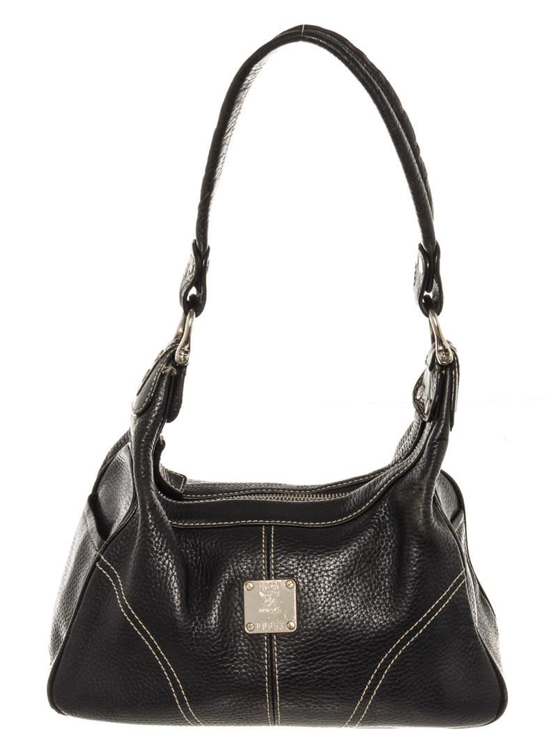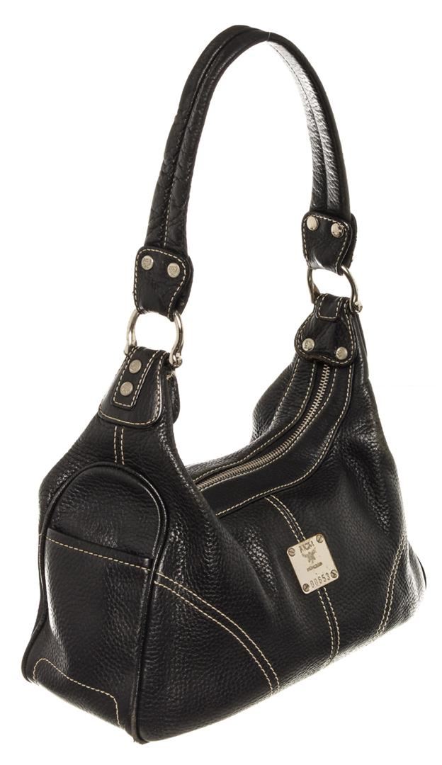 Black leather MCM Contrast Stitch hobo bag with silver-tone hardware, logo placard at front, single flat shoulder strap, protective feet at base, zip closure at top, black logo jacquard lining and one zip pocket inside. 11.8"x5.9"x9.1", Handle Drop : 7
