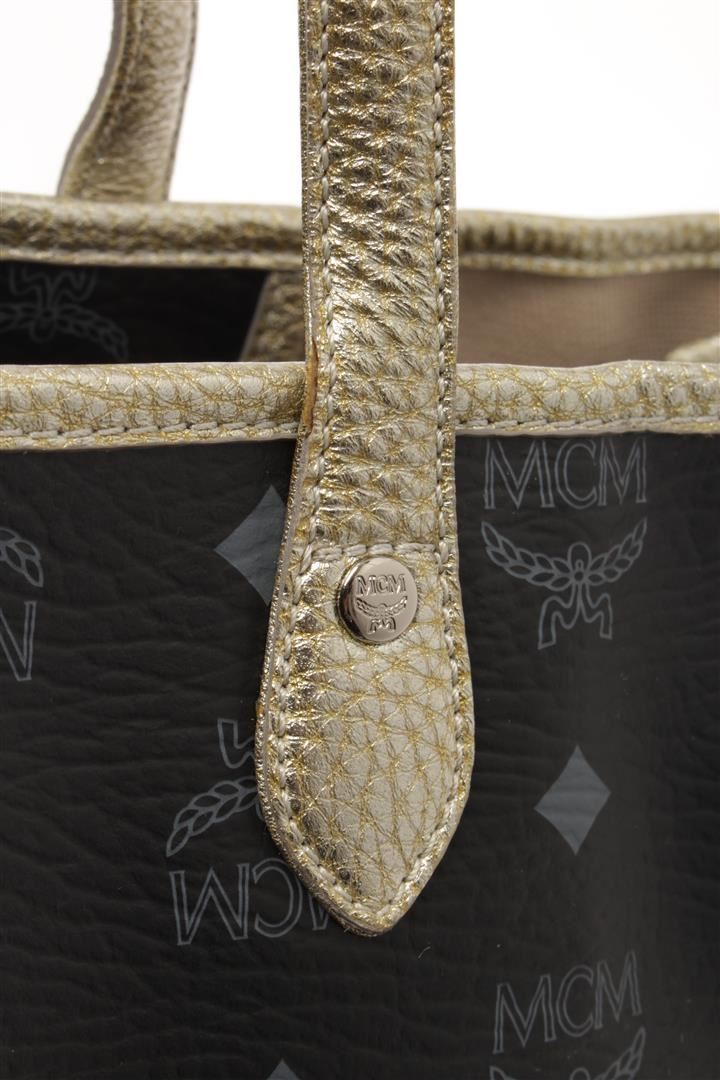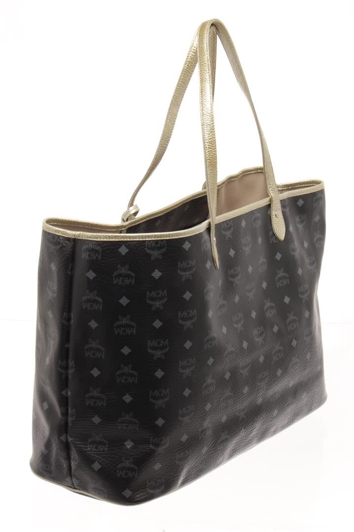 One MCM Black Visetos Leather Striped Lion Shopper Bag. Item is sold AS-IS. All available information is listed in the description and shown in the photo. MCM Black Visetos Leather Striped Lion Shopper Bag with black leather logo patterned exterior, multicolor stripes with a silver lion on front center, gold leather trims, top handles, and tassel; beige canvas lining, open top, gold-tone hardware, and one interior zip pocket.